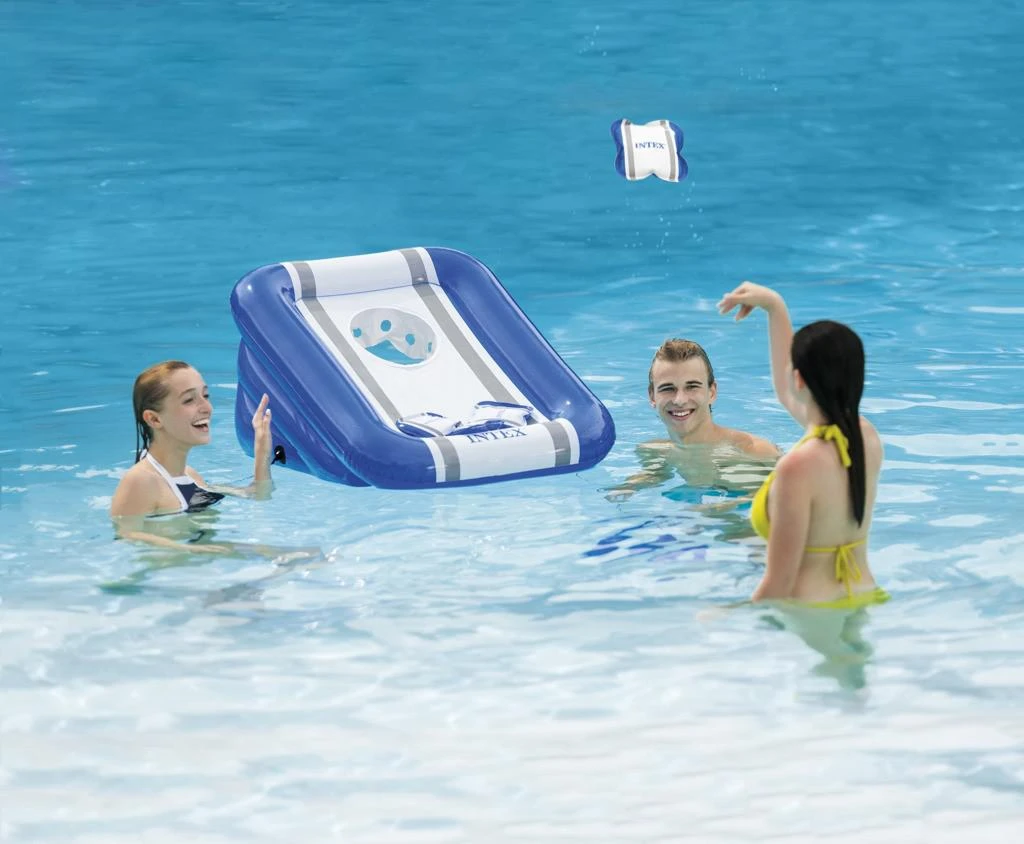Zábavna nafukovací hra do bazénu. Základna o velikosti 86cm x 71cm x42 cm. Zahrnuje 4 nafukovací polštářky, které lze naplnit vodou a2 kotevní taštičky. Lze použít ve vodě i na trávě. Cílem hry jetrefit se polštářkem do základny. Opravná záplata přiložena. Vyrobenoz kvalitního vinylu.