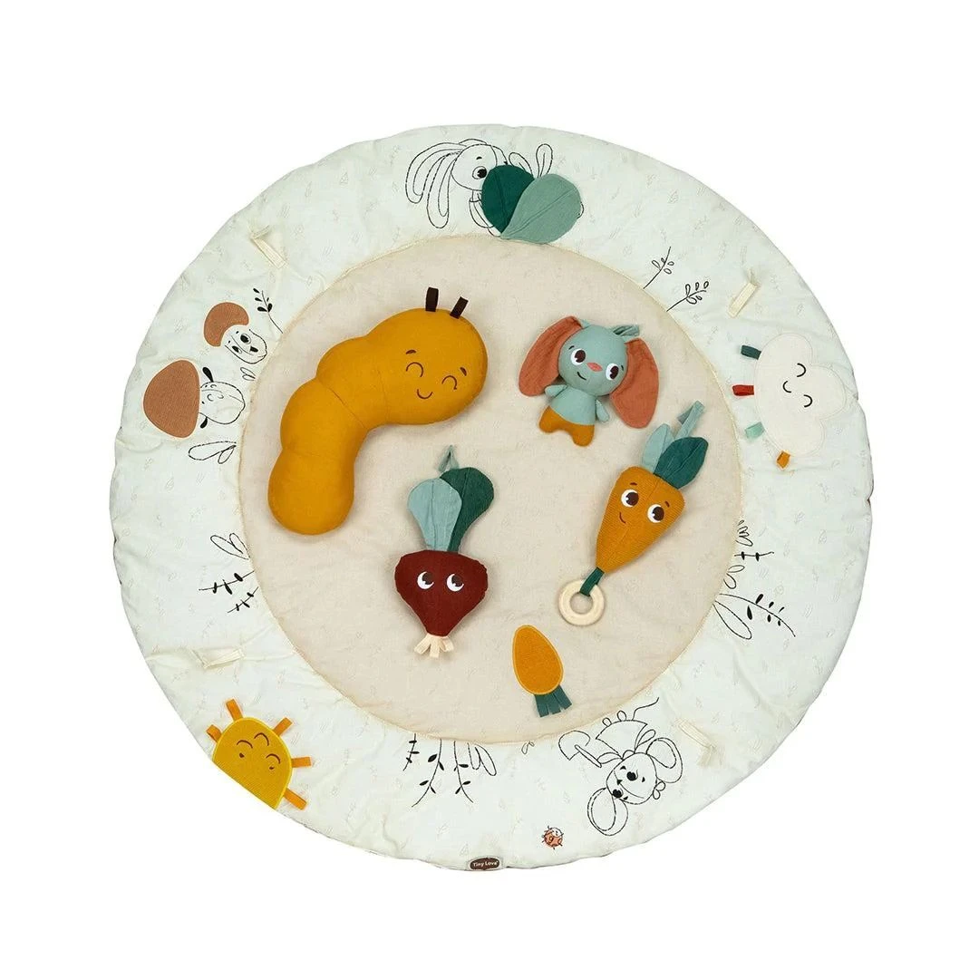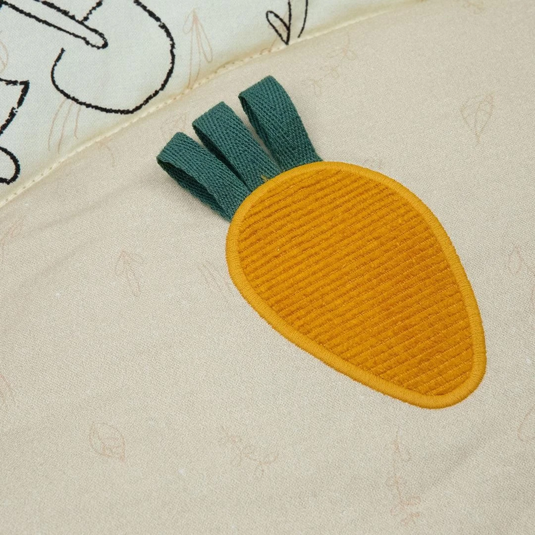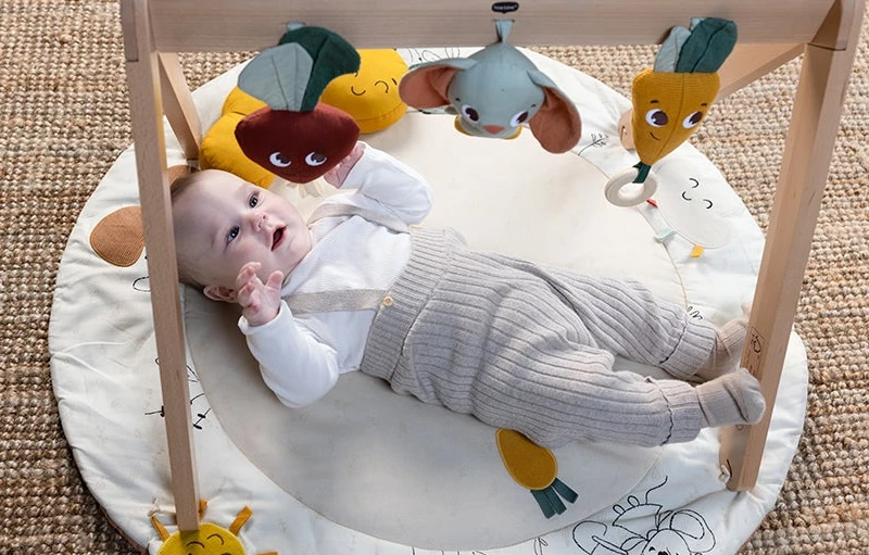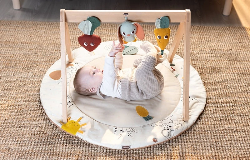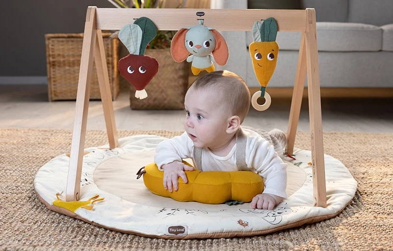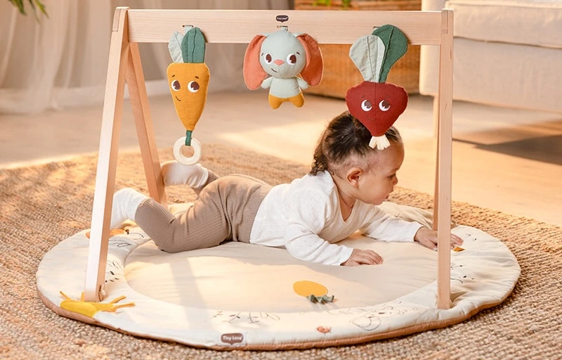 Odnímatelná dřevěná hrazda umožňuje zavěšení hraček v podobě chrasticí řepy, roztomilého králíčka a mrkvičky s kroužkem pro uchopení. Přímo na dece najdete textilní aplikace s různými texturami a stážkami pro zkoumání.