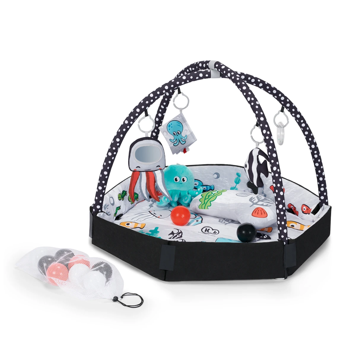 Když dítě vyroste, bude moci cvičit otáčení z břicha na záda. Mořský design a tlumené barvy v rozích SEA LAND upoutají pozornost dítěte na delší dobu. K podložce je přiložen polštář, který usnadňuje ležení na bříšku. Když dítě vyroste a začne sedět samo, podložku lze přeměnit na suchý bazén s kuličkami (20 barevných kuliček v sadě) a měkkým polštářem. K podložce je navíc přiloženo 6 hraček: chrastítko, hryzátko, plyšová chobotnice, plyšová ryba s hryzátkem a píšťalkou, zrcátko chobotnice a šustící kniha. Kromě toho je k podložce SEA LAND přiložen měkký polštář v mořském stylu, který podporuje ležení na bříšku. Je vybavena nastavitelnými hrazdičkami, závěsné hračky lze libovolně přesouvat a připnout na jakékoliv místo. Vyrobená z měkkých, příjemných na dotek materiálů - dítě se na ni bude určitě cítit velmi pohodlně. Navíc dokonale izoluje od podlahy.