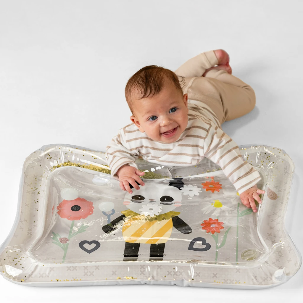 Uvnitř podložky se pohybují barevné hračky a třpytky, které podporují zvídavost a delší soustředění