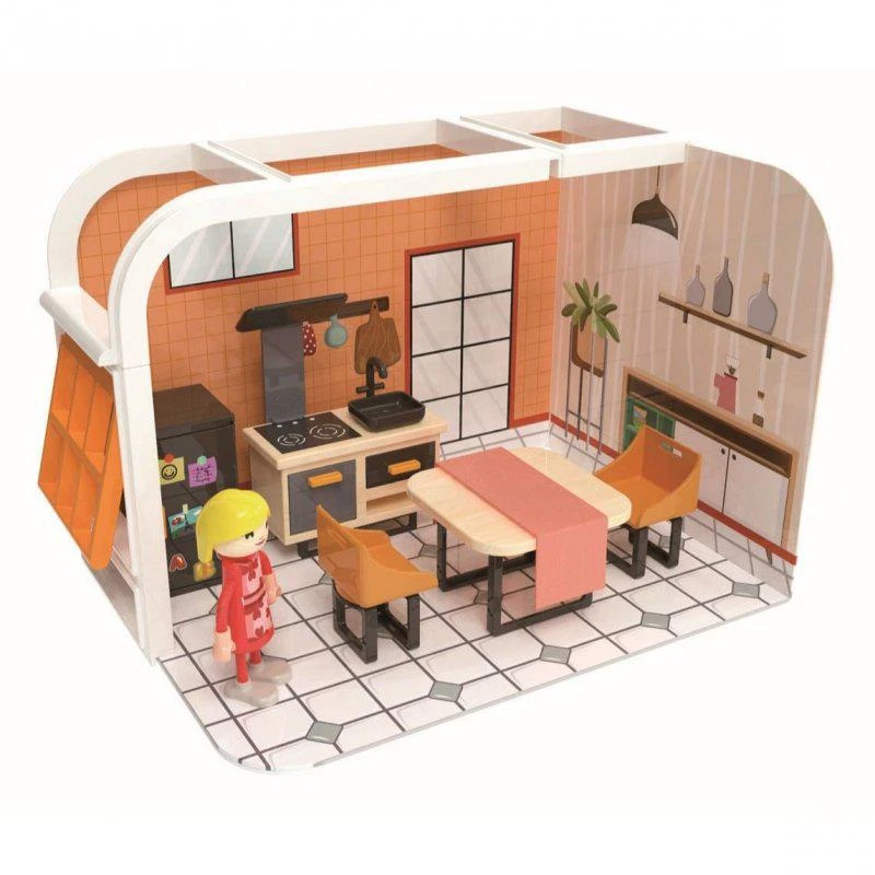 - příslušenství: stůl se 2 židlemi, lednice, kuchyňská linka se dřezem a sporákem, otevírací okno, pohyblivá panenka