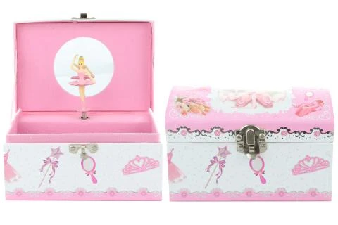 Hrací skříňka šperkovnice s baletkou. Uvnitř špekovnice je zrcátko a baletka, která po natažení klíčku tančí a hraje. Velikost cca 16 x 10,5 x 11 cm. Baleno v igelitovém sáčku. Věk 3+