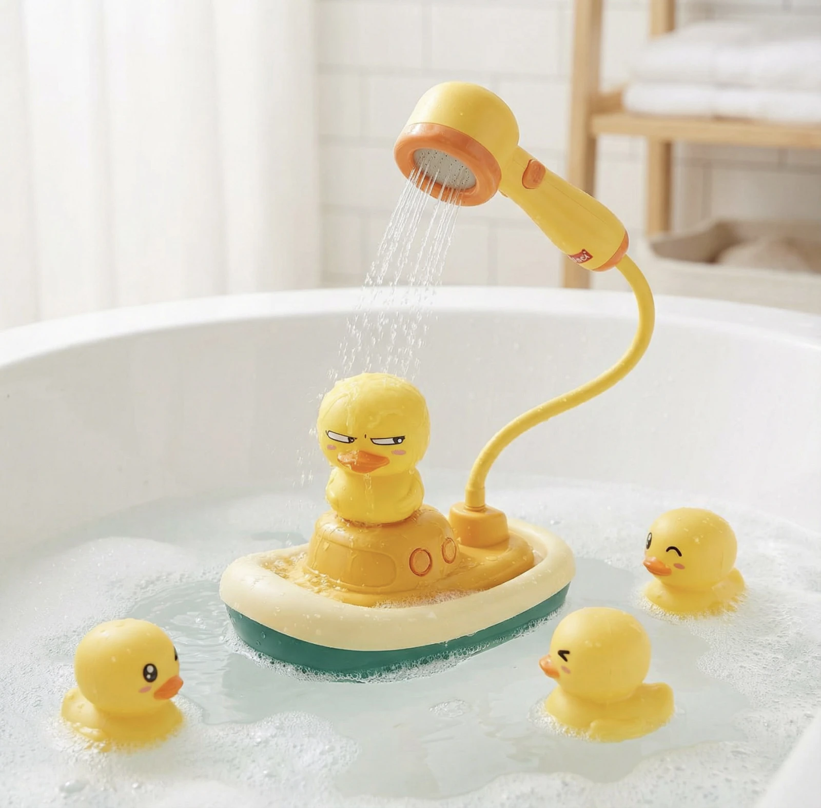 Kachničky stříkají vodu z různých částí těla – z hlavy, z úst nebo z rukou, což dělá každou hru jinou a podporuje dětskou zvědavost. Čtvrtá kačenka je připojena ke sprše, ze které teče voda, a děti ji mohou zároveň sprchovat, zalévat a zapojovat do vlastních vodních příběhů.
