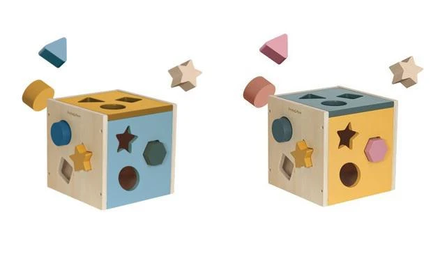 Souprava obsahuje dřevěnou kostku se čtyřmi stranami pro třídění a 12 barevných kostek různých tvarů, například trojúhelníku, hvězdy, čtverce, kosočtverce nebo kruhu.