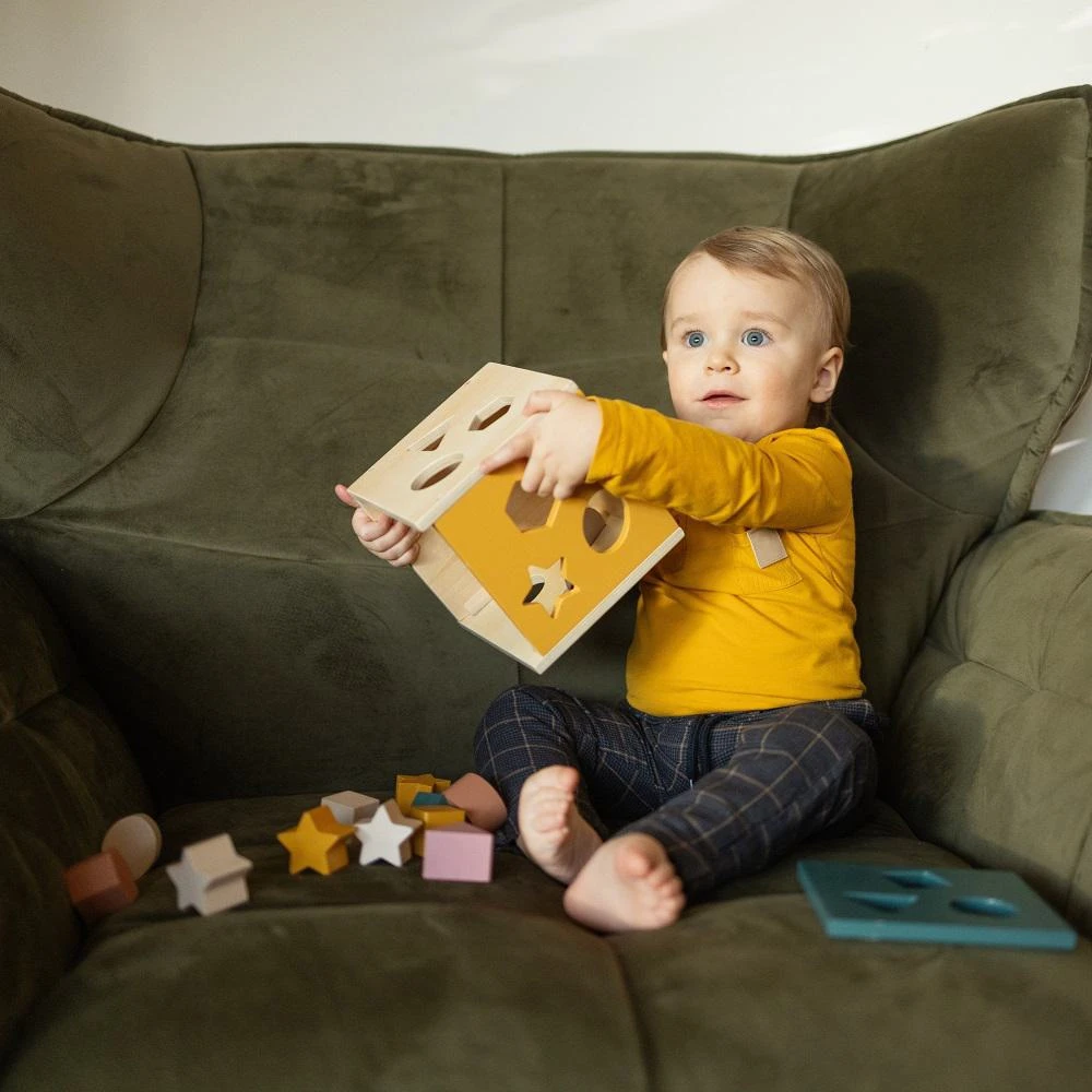 Když jsou všechny dílky uvnitř třídící kostky, jednoduše vysunete horní kryt, abyste je mohli snadno vyjmout zpět. Děti mohou nejen přiřazovat tvary k otvorům a třídit díly, ale také je používat ke stavbě různých prvků.
