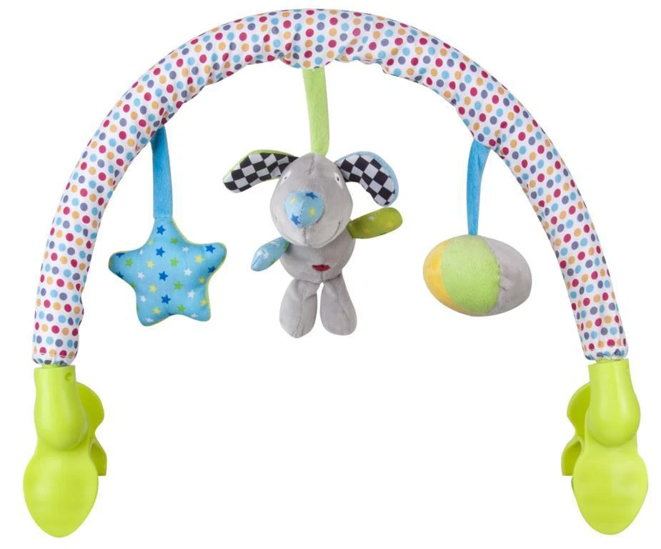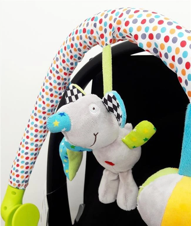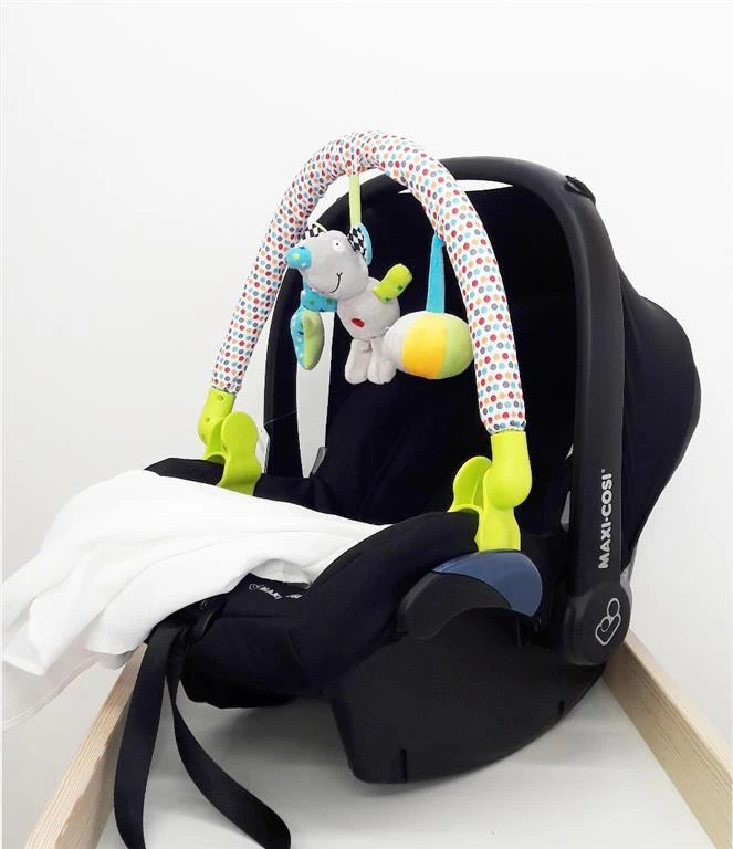 - Ohebná hrazdička s hračkami, kterou díky sponám uchytíte ke kočárku, lehátka, autosedačky nebo nosítka.