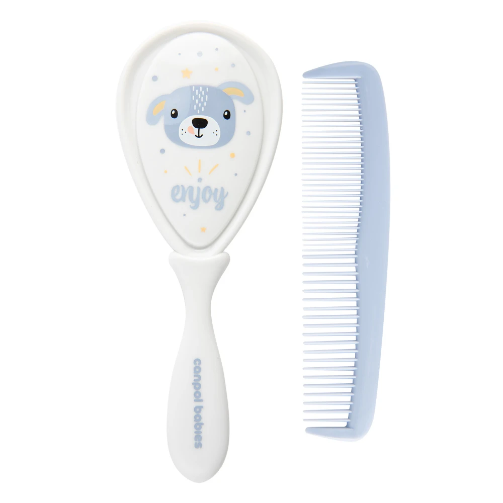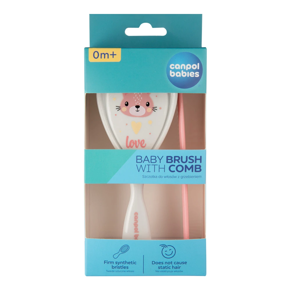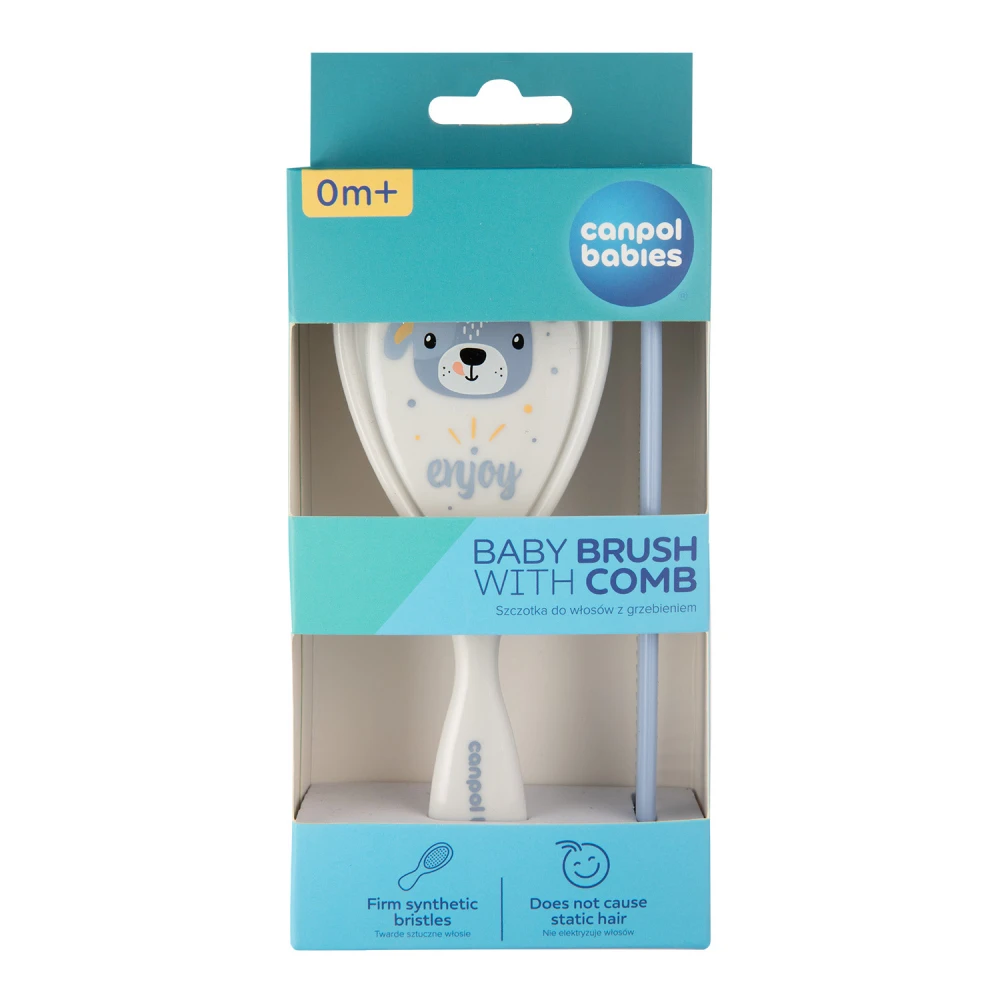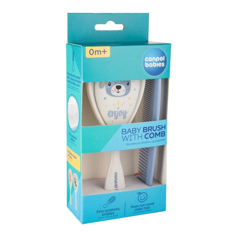 Kartáč na vlasy s hřebenem pro každodenní péči o vlasy děťátka. Hřeben má zaoblené zuby, které nedráždí citlivou pokožku. Kartáč s měkkými umělými štětinami jemně masíruje hlavu děťátka, aniž by mu elektrizoval vlasy. Sada je dostupná ve - dvou variantách.