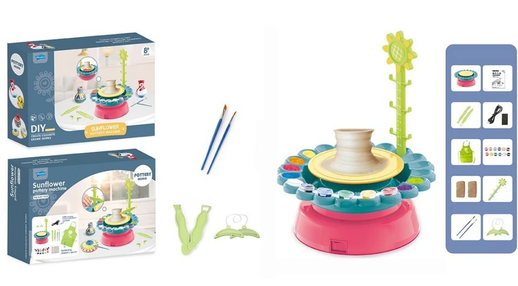 Součástí balení je otočný kruh, tvarující hmota, barvičky a několik různých tvořítek. Rozměr balení: 36 x 8,3 x 24 cm Napájení: akumulátor 3,7V je součástí balení, 2 x 1,5V (AA) nejsou součástí balení.
