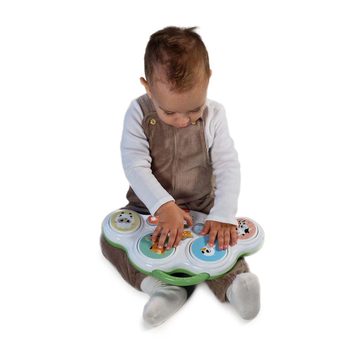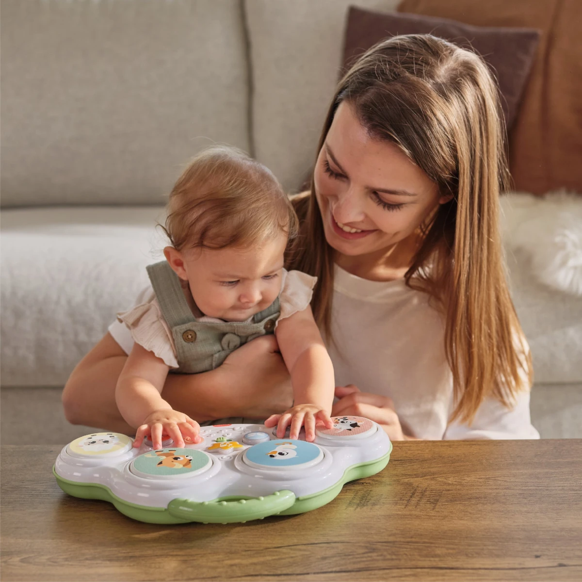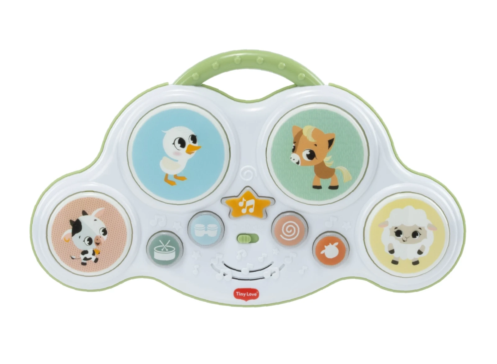 Hudební pult s bubínky Tiny Love Farmers Funday děti zábavnou formou motivuje k objevování zvuků, rytmu i zvířátek. Čtyři bubínkové plochy a světelná tlačítka spouští bubnové rytmy, vtipné zvuky i farmářské zvířecí efekty, takže hra dítě dlouho udrží v pozornosti.