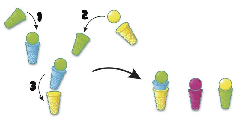 Každý hráč má 4 kornoutky a v nich 3 kopečky zmrzliny. Hráči musí co nejrychleji seřadit kopečky a kornoutky podle karty zadání tak, aby jim žádný kopeček nespadl a zároveň se ho nedotkli rukou.