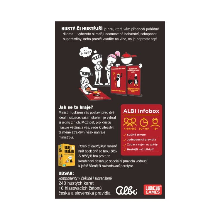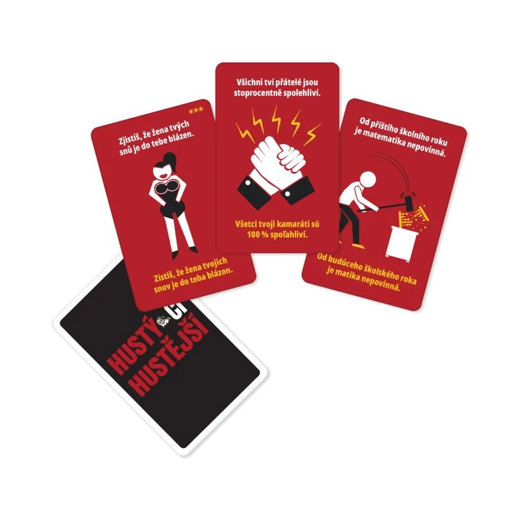 Hra Hustý či hustější obsahuje: 240 karet, 16 hlasovacích žetonů, pravidla v českém a slovenském jazyce.