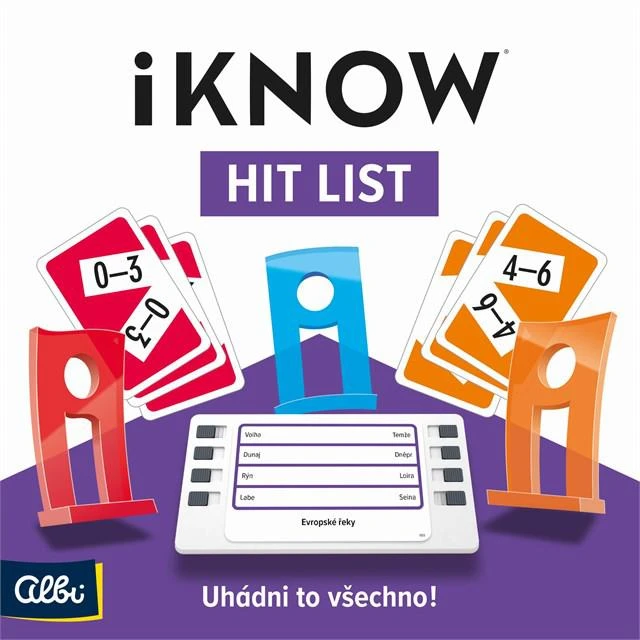 Kvízová hra iKnow HIT List obsahuje 6 figurek iKnow, 282 karet s 564 zadáními, 18 karet iBET, 1 HIT List destičku, přesýpací hodiny a pravidla.