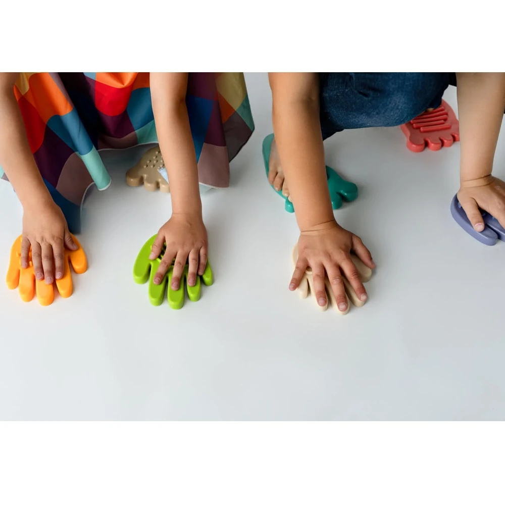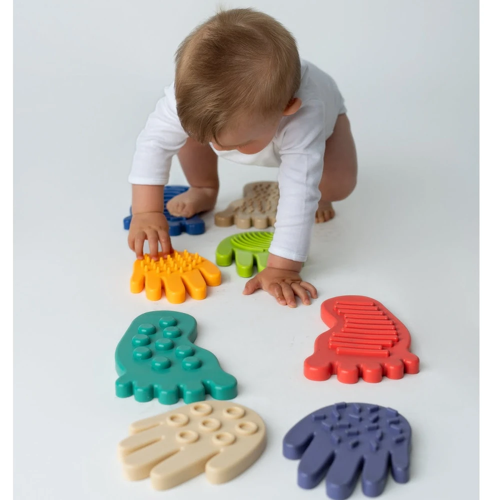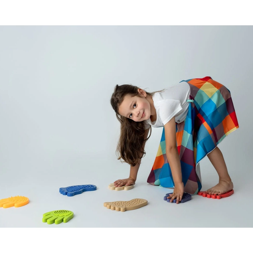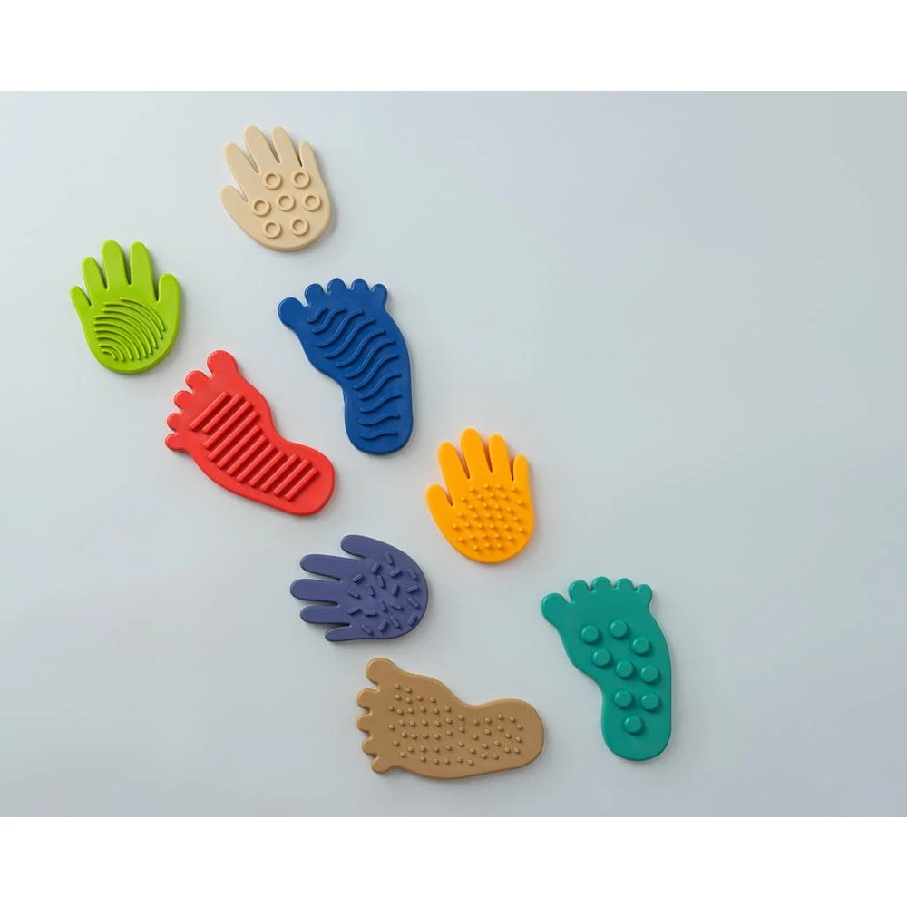 Senzorická stezka Sensorky je unikátní sada skládající se z 8 prvků: 4 nohou a 4 rukou, z nichž každý má jinou senzorickou strukturu. Sada obsahuje také balíček karet s aktivitami, které inspirují k různým cvičením a aktivní hře.