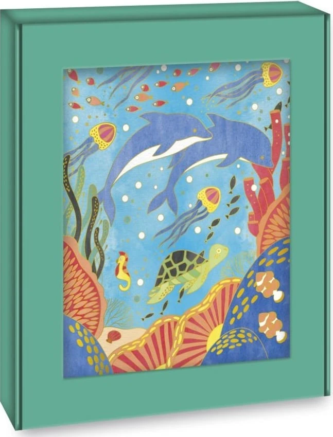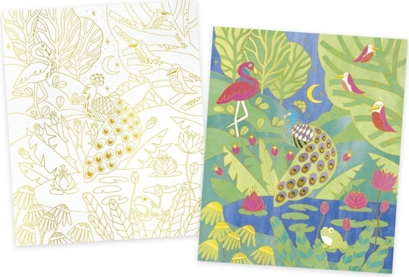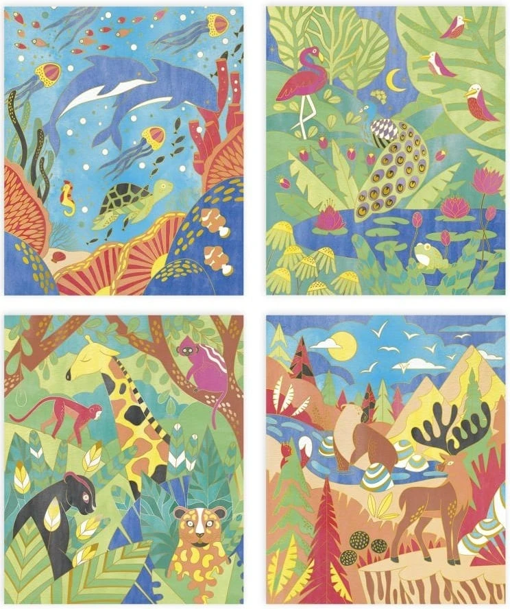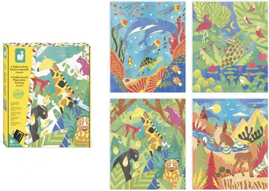 Tato kreativní sada obsahuje 4 obrázky představující vodní, exotická, horská a džunglová zvířata. Štětec naplněný vodou, který dokáže snadno aplikovat 15 akvarelových odstínů dodávaných na paletě. Dále přijdou vhod zlaté linky, které zabraňují šíření barev a tím i míchání! Obrazům také dodají ultra rafinovaný konečný výsledek. A nakonec se krabička promění v krásný rám na prezentaci výtvorů!