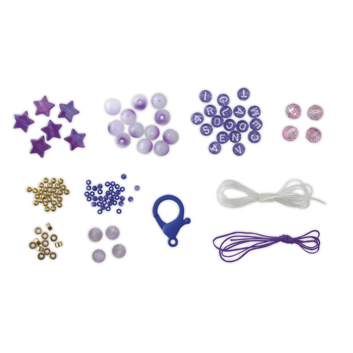 Díky působivému obsahu (18 fialových korálků s písmeny, 6 korálků s hvězdičkami, 12 zlatých kovových korálků, 120 kulatých zlatých kovových korálků, 60 modrých korálků, 4 korálky s růžovými fazetami, 4 průhledné kulaté korálky, 12 fialových korálků, elastická nit, fialová nefritová nit, 1 plastová spona na karabinku a 1 brožurka s návodem a vzory) bude tato sada ideální pro ty, kteří milují šperky přátelství.