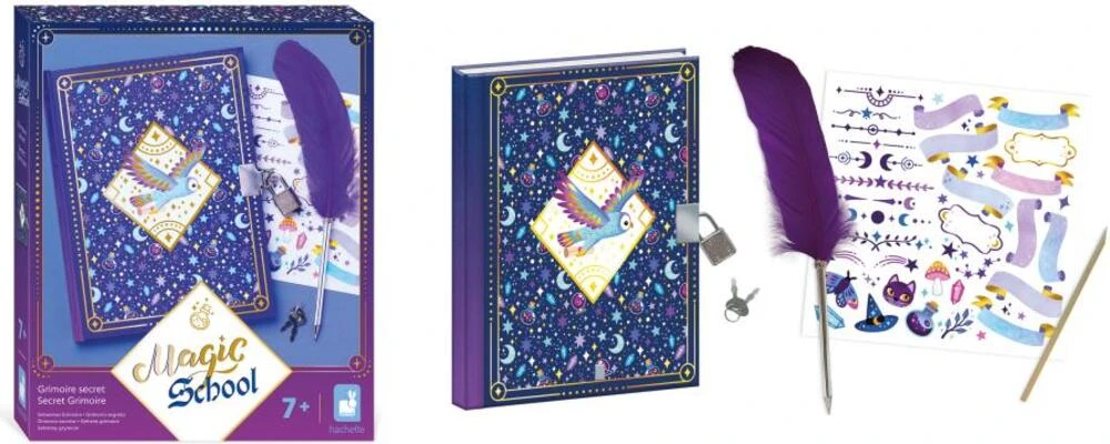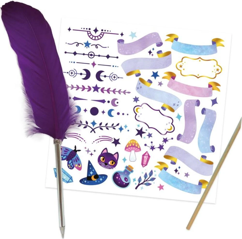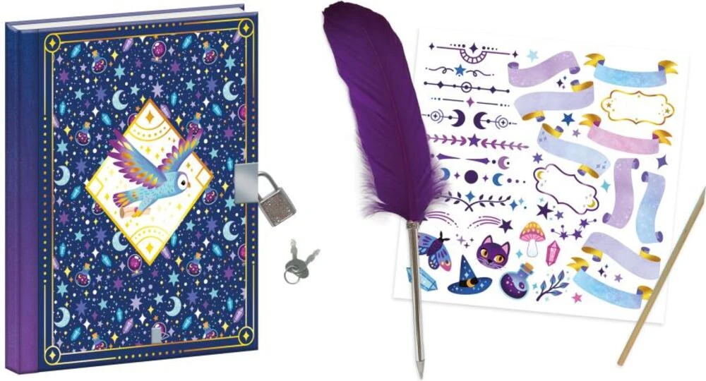 Tato kreativní sada obsahuje 96-stránkovou tajnou knihu kouzel s 1 visacím zámkem a sadou 2 klíčů. Hezké fialové inkoustové pero ve tvaru peříčka a arch obtisků doplňuje sadu na přizpůsobení vašeho diáře.