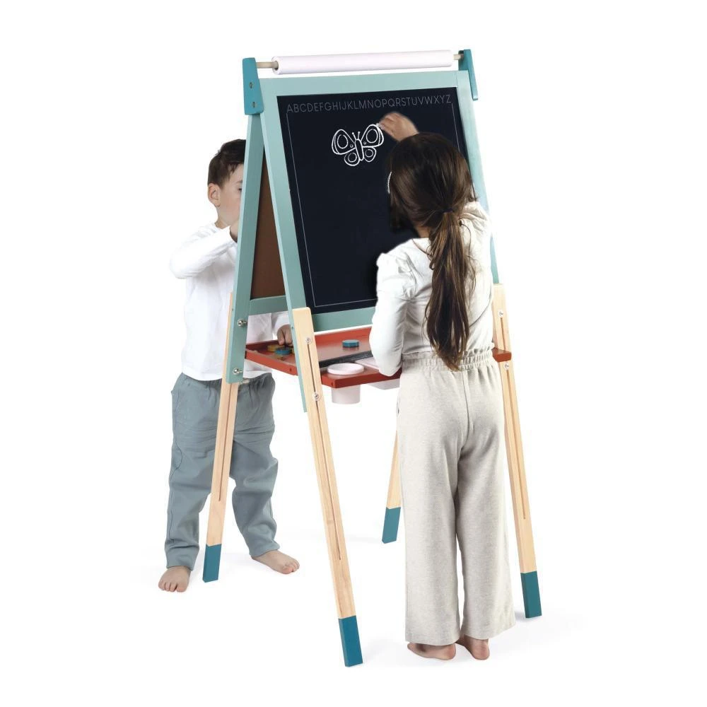Díky všem těmto doplňkům a dvěma stranám tabule může několik dětí psát a kreslit současně! Je ideální pro rozvíjení jejich představivosti a tvůrčího projevu. Díky pestrým barvám, hravým prvkům a četným doplňkům si tato skládací tabule jistě najde své místo v každém dětském pokoji... Nebo proč ne v obýváku?
