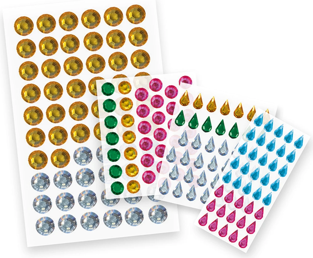 Krabička obsahuje: 4 obrázky180 velkých samolepicích kamínků (2 tvary, 2 velikosti, 5 barev). Pokyny a vzory jsou vytištěny uvnitř krabice.