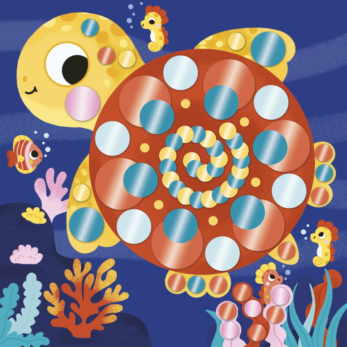 Obsahuje 4 podložky o rozměrech 20 x 20 cm (páv, dinosaurus, leopard a mořská želva), 4 listy kovových nálepek ve tvaru teček ve 3 různých velikostech (30, 20 a 10 mm) a leták s návodem a vzory.