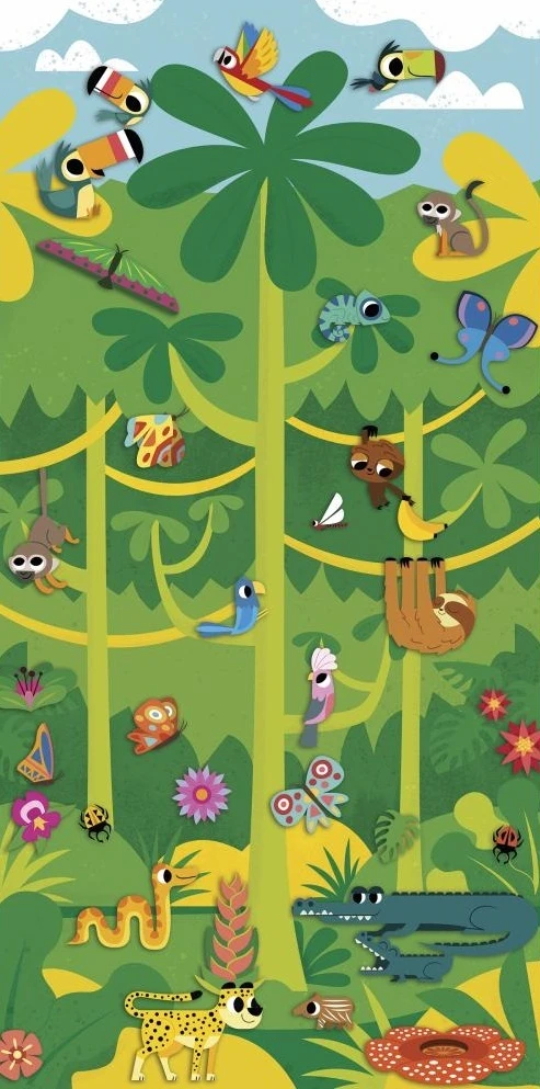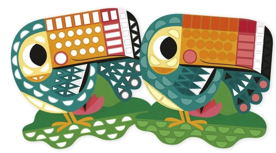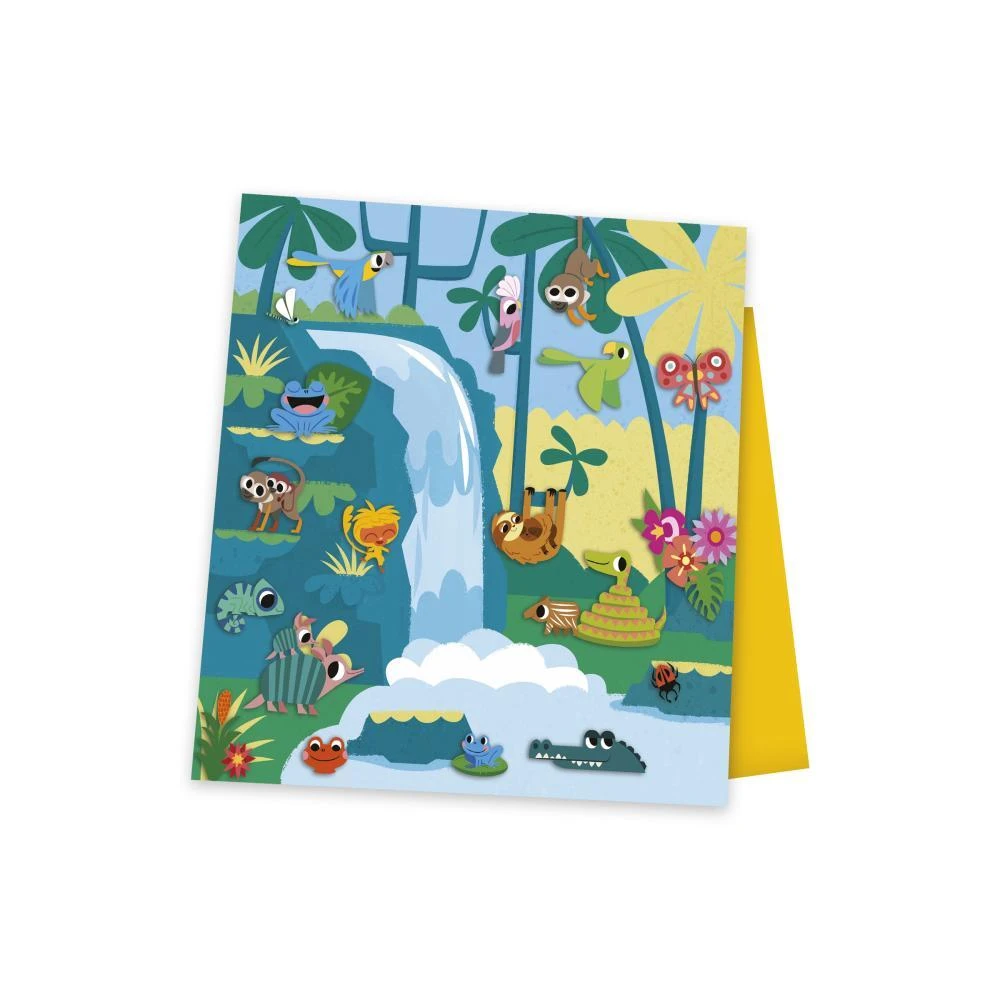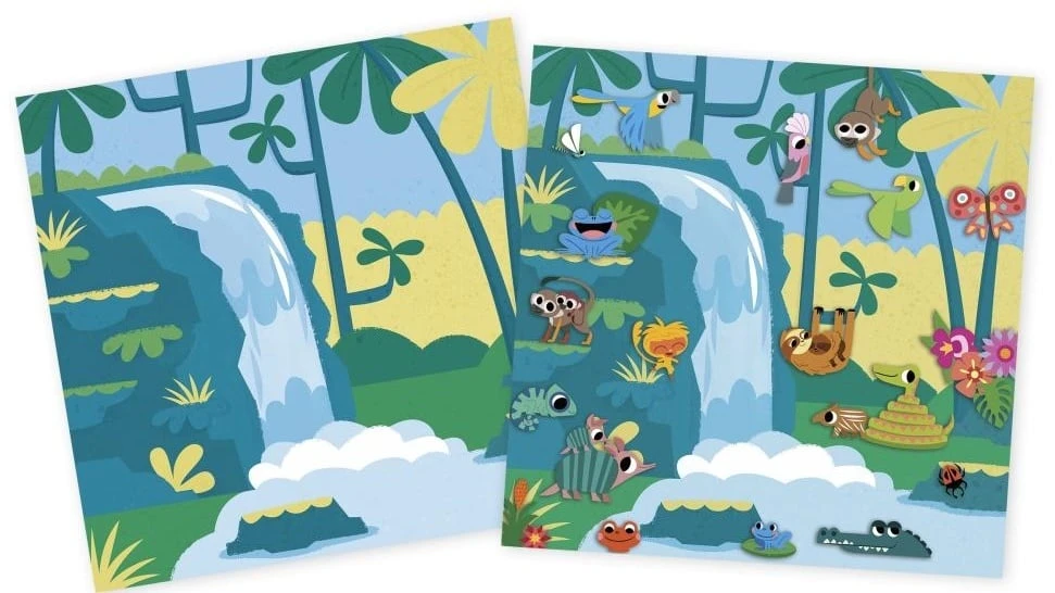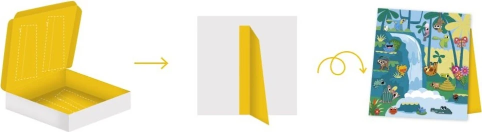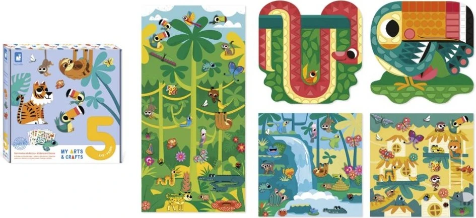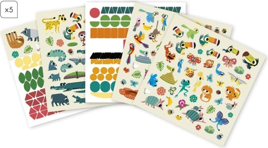 Obsah: 5 barevných obrázků, 3 archy s nálepkami zvířátek a 2 archy s geometrickými nálepkami. Úkolem je dotvořit obrázky barevnými nálepkami různých tvarů. Vaše dítě se bude bavit při dokončování roztomilých, barevných scén s tematikou džungle.