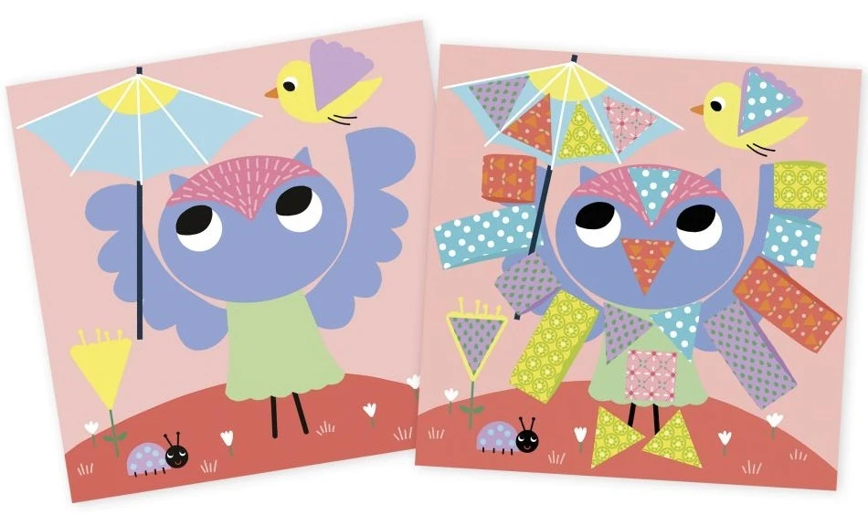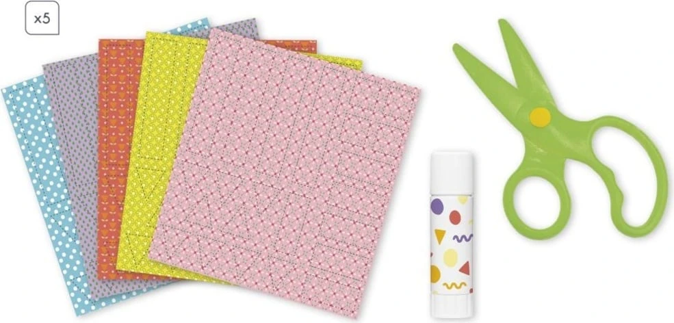 Součástí balení jsou bezpečné dětské nůžky (stříhají pouze papír) a 5 archů vzorovaného papíru, které podpoří kreativitu začínajících umělců. Aktivita je velmi jednoduchá: stačí vystřihnout předkreslené tvary z papíru a pomocí přiložené lepicí tyčinky je umístit na správné místo. Děti mohou postupovat také podle návodu v brožuře.