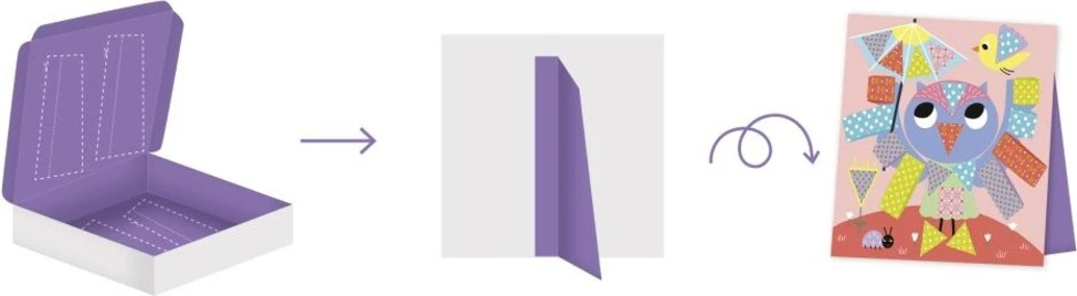 Tato kreativní sada obsahuje vše, co malí tvůrci potřebují k dokončení 4 obrázků – děti vystřihnou vzorované papírové prvky a nalepí je na správné místo. Clever Box splní přesně to, co slibuje na obalu – promění se ve stojánek pro vystavení hotových výtvorů.