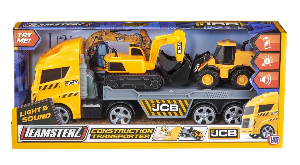 JCB transportní vozidlo je detailně propracovaný model stavebního transportéru, který přináší dětem autentický zážitek ze stavebních prací. Vozidlo je vyvedeno v charakteristické žluté barvě JCB, která je doplněna černými a šedými detaily, což mu dodává realistický vzhled. Transportér disponuje volně pohyblivými koly, která umožňují snadné posouvání po různých površích. Na přední části kabiny jsou umístěna blikající světla, která spolu se zvukovými efekty motoru vytvářejí věrnou atmosféru práce na stavbě.