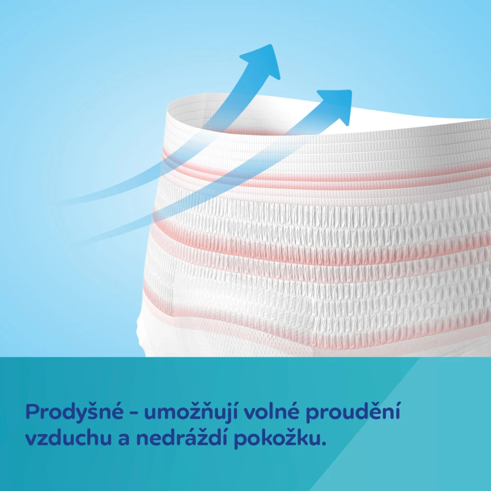 Kalhotky absorbují až 400 ml tekutiny a poskytují tak žádoucí pocit sucha. Pokročilá 360° ochrana proti úniku zajišťuje plnou ochranu ze všech stran, a to i vleže. Prodyšný design umožňuje pokožce volně dýchat, čímž se minimalizuje riziko podráždění, zatímco výjimečně měkká vnitřní vrstva je bezpečná i pro tu nejcitlivější pokožku.