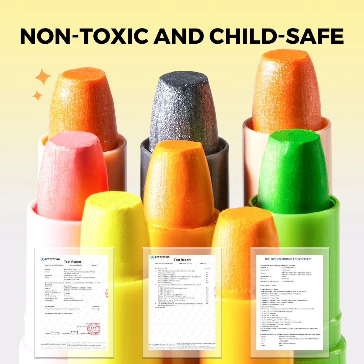 Rodiče potěší, že voskovky jsou omyvatelné, nezanechávají skvrny a díky bezpečnému složení z glycerinu jsou zdravotně nezávadné – vhodné i pro malování na obličej. Praktický vysouvací obal chrání voskovky před lámáním a udržuje je vždy připravené k použití.
