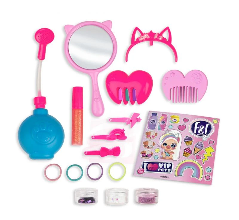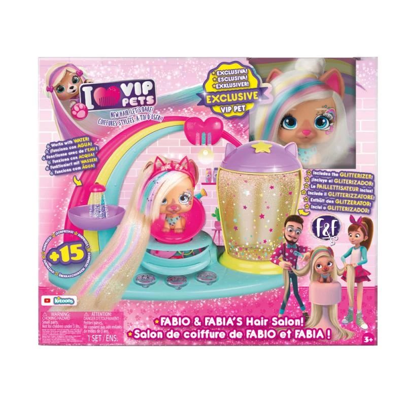 Vítejte v kadeřnickém salónu VIP Pets Fábio & Fábia! Zde vítáme naše skvělé zákazníky, zde se dějí opravdová kouzla! Na tomto úžasném místě se potkáváme s našimi výjimečnými kamarády. Mají čtyři nohy a nádhernou hřívu. Ano jsou to pejskové VIP Pets! Přijďte společně s nimi objevovat svět plný účesů a dobrodružství, které budete milovat! Nejmódnější mazlíčci se super dlouhými česacími vlasy vám dávají příležitost vytvořit tisíce účesů. VIP Pets jsou stylové, přátelské a okouzlující. Kadeřnický salón VIP Pets Fabio & Fabia obsahuje: exkluzivního pejska VIP Pets, duhový kartáč, lesklou kapsli, zásuvky vlasové ozdoby, šampon a houbičku na vlasy a 10 různých typů vlasových doplňků a dekorací.