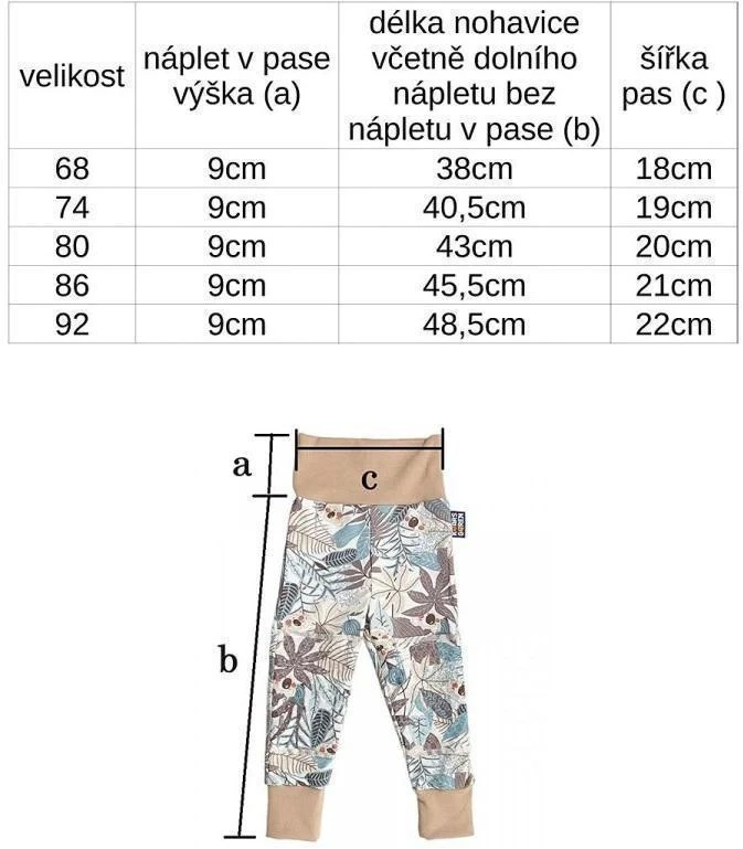 Kalhoty mají praktický široký lem v pase i na nohavicích a přehnutím, nebo natažením je lze používat delší dobu než kalhoty klasické - vydrží i přes dvě velikosti.