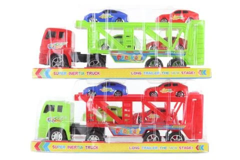 Plastový kamion přepravník o rozměru cca 32 x 10,5 cm se 4 auty o rozměru cca 8,5 x 3 cm.