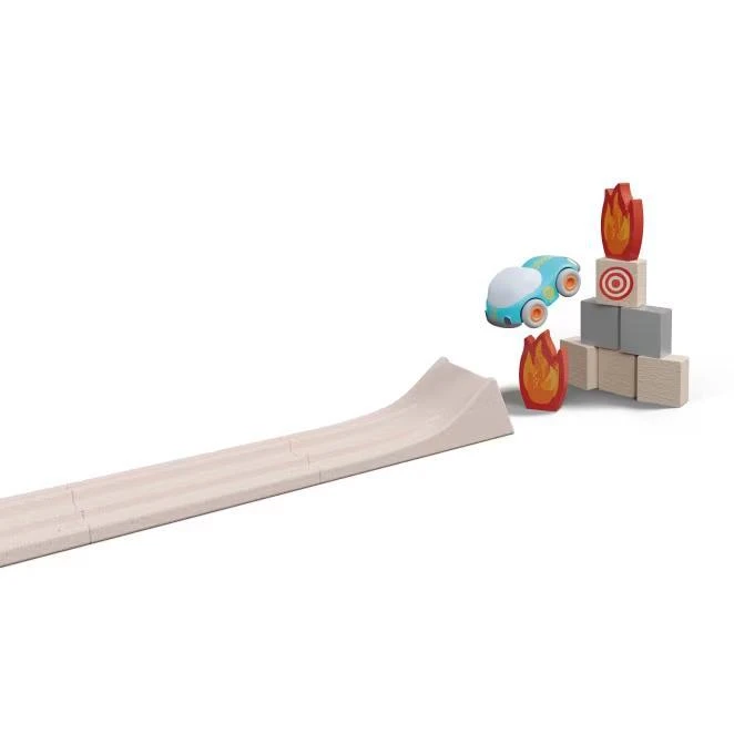 Tato akční kaskadérská dráha je perfektní pro malé nadšence aut! Díky extra velkým dílům a jednoduchým zásuvným spojům si ji děti snadno sestaví samy – bez pomoci dospělých.