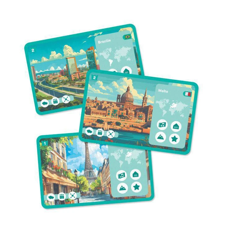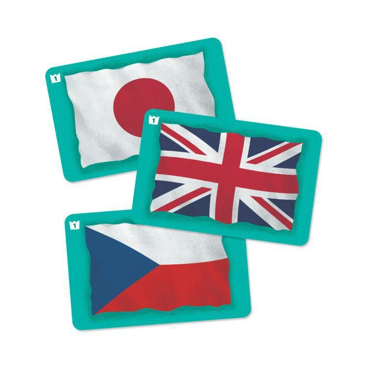 Hra Vlajky obsahuje: 120 herních kartiček, 1 ovládací kartu, hrací žetony a tištěná pravidla.