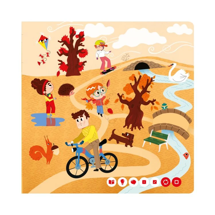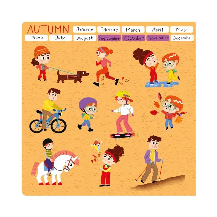 Co dělají Albert s Emou na jaře na zahradě? Čím se baví táta v létě u moře a máma na podzim v parku? A jak tráví čas děda s babičkou v zimě u vánočního stromku?