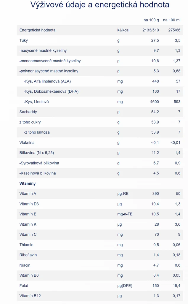 Složení: BIO plnotučné mléko (124.4 g plnotučného mléka na 100 g prášku), BIO demineralizovaná bílkovina mléčné syrovátky v prášku, BIO odstředěné mléko, BIO rostlinné oleje (slunečnicový, kokosový, řepkový), BIO laktóza (z mléka), citronan vápenatý, citronan sodný, Chlorid draselný, Laktát vápenatý, Chlorid hořečnatý, Kyselina dokosahexaenová (olej z mikrořas Schizochytrium Sp. T18), Vitamín C, Hydroxid draselný, Cholin bitartrát, Inositol, Pyrofosforečnan železitý, Síran zinečnatý, L-karnitin, Vitamin E, Niacin, Kyselina pantothenová, Síran měďnatý, Thiamin (B1), Riboflavin (B2), Vitamín A, Vitamín B6, Síran manganatý, Kyselina listová, Jodid draselný, Seleničitan sodný, Vitamín K, Vitamín D3, Biotin, Vitamín B12, Alergeny jsou označeny modře.