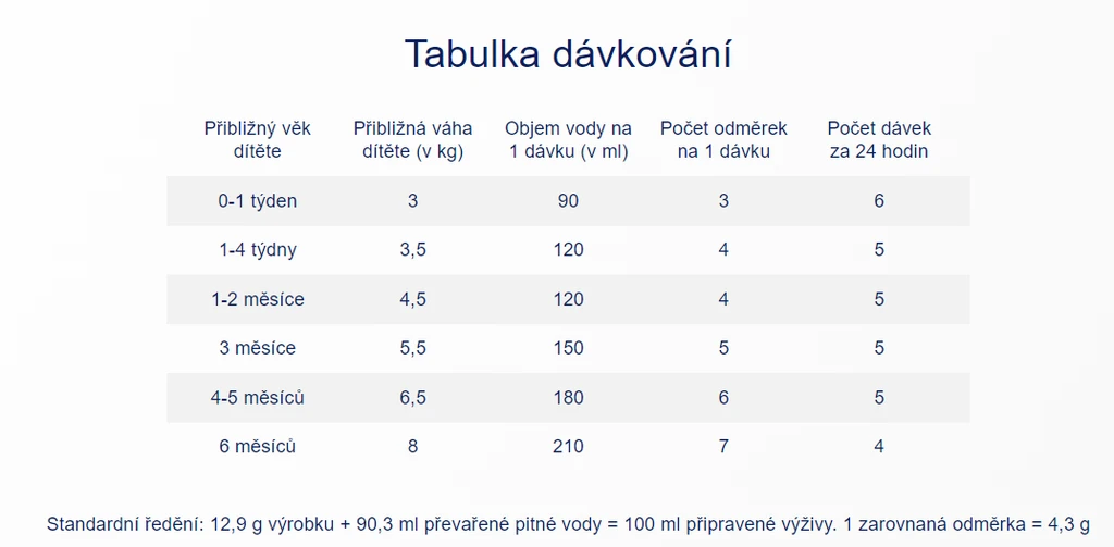 DŮLEŽITÉ INSTRUKCE PRO KRMENÍ: Používejte správné množství zarovnaných odměrek, jak je instruováno. Dítěti může být špatně při použití více nebo méně odměrek, než je nařízeno. Pokud připravené UM nevyužijete do 2 hodin od připravení, doporučujeme jej vylít a připravit nové. Nepřidávejte do připraveného UM produkty, které jsou určené pro dospělé, jako je trvanlivé kravské mléko apod. Neohřívejte v mikrovlnné troubě.