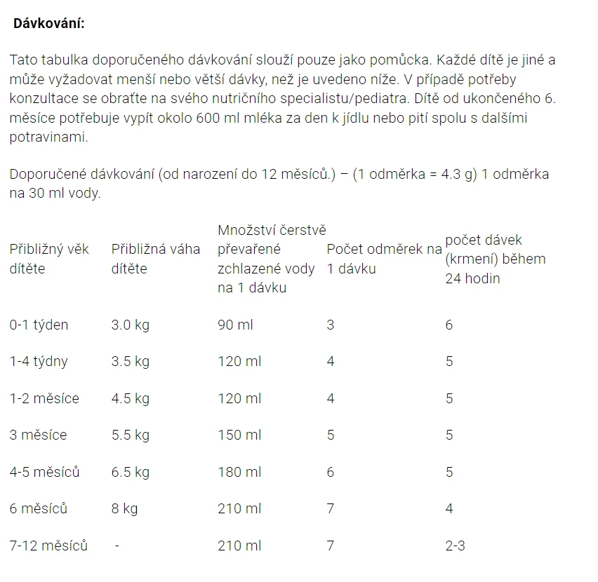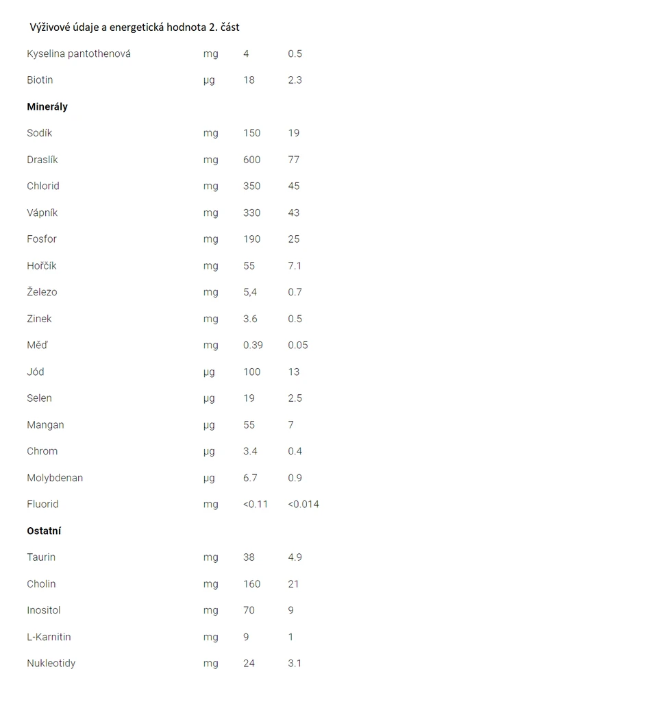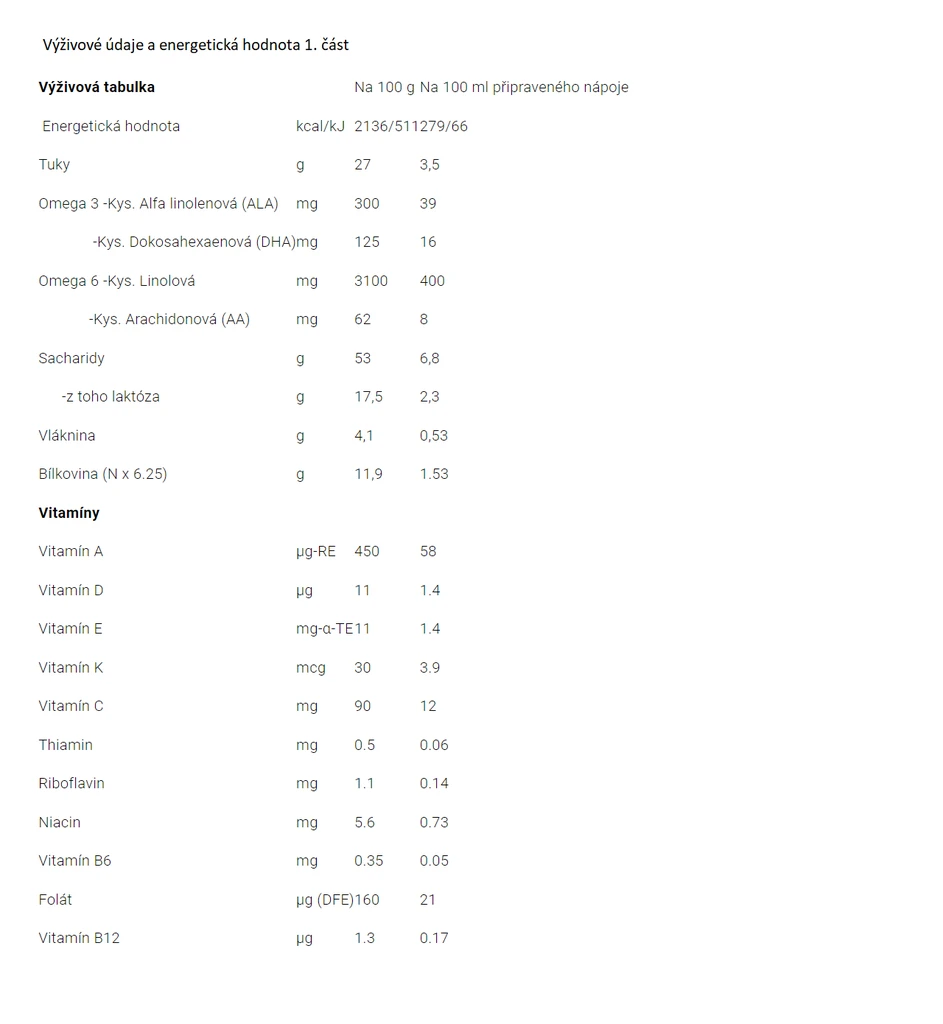 Složení: Rozpustný škrob, laktóza (z mléka), mléčný tuk, rostlinné oleje (slunečnicový, řepkový, kokosový), koncentrát částečně hydrolyzované syrovátkové bílkoviny (z mléka), galakto-oligosacharidy (z mléka), koncentrát syrovátkové bílkoviny obohacený o alfa-laktalbumin (z mléka), sušené odstředěné mléko, škrob (kukuřičný), frukto-oligosacharidy, chlorid hořečnatý, cholin bitartát, chlorid draselný, citronan vápenatý, olej z mikrořas Schizochytrium sp., fosforečnan trivápenatý, fosforečnan vápenatý , mléčnan vápenatý, citronan sodný, hydroxid draselný, olej z Mortierella alpina, L-askorbová kyselina, inositol, L-arginin, taurin, L-histidin, nukleotidy (cytidin-5‘-monofosfát, sodná sůl uridin-5‘-monofosfátu, adenosin-5‘- monofosfát, sodná sůl inosin-5-monofosfátu, sodná sůl guanosin-5‘-monofosfátu), pyrofosfát železitý, síran zinečnatý, L-karnitin, vitamín E, niacin, D-pantothenát vápenatý, riboflavin, síran měďnatý, vitamín A, thiamin, vitamín B6, síran manganatý, jodid draselný, kyselina listová, seleničitan sodný, vitamín K, vitamín D, biotin, vitamín B12. Alergeny jsou vyznačeny tučně.