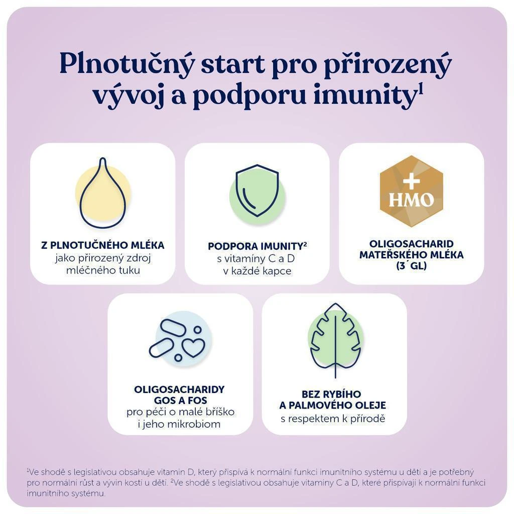 Plnotučné mléko (107 g tekutého mléka na 100 g prášku), demineralizovaná syrovátková bílkovina (z mléka), rostlinné oleje (slunečnicový, kokosový, řepkový), laktóza (z mléka), sušené odstředěné mléko, galaktooligosacharidy (z mléka) 3 %, koncentrát syrovátkové bílkoviny obohacený o alfa-laktalbumin (z mléka), chlorid draselný, citronan sodný, cholin bitartrát, citrát vápenatý, fruktooligosacharidy 0,2 %, chlorid hořečnatý, fosforečnan vápenatý, mléčnan vápenatý, olej z mikrořas Schizochytrium sp., L-askorban sodný, hydroxid draselný, inositol, L-thyrosin, olej z Mortierella alpina, taurin, nukleotidy (cytidin-5'-monofosfát, sodná sůl uridin-5'-monofosfátu, adenosin-5'-monofosfát, sodná sůl inosin-5'-monofosfátu, sodná sůl guanosin-5'-monofosfátu), L-fenylalanin, síran železnatý, síran zinečnatý, vitamín E, niacin, D-pantothenát vápenatý, síran měďnatý, thiamin, riboflavin, vitamin A, vitamin B6, síran manganatý, jodid draselný, kyselina listová, seleničitan sodný, vitamin K, vitamin D3, biotin, vitamin B12, regulátor kyselosti (kyselina citronová).