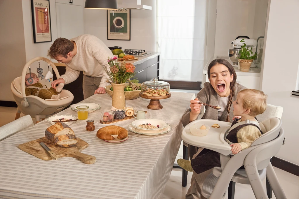 FINI UP spojuje lehátko pro nejmenší, jídelní židličku a pohodlné sezení pro větší dítě - v jednom sjednoceném designu, který zapadne do domácnosti. Přirozeně kopíruje rytmus domova: od prvních zdřímnutí v pololehu, přes období zavádění příkrmů, až po každodenní sezení u stolu, když chce dítě být nablízku dění v kuchyni a jídelně. Rodiče oceňují, že místo výměny nábytku každých pár měsíců stačí rychlá změna nastavení - bez použití nářadí - a židlička je připravená na další etapu.