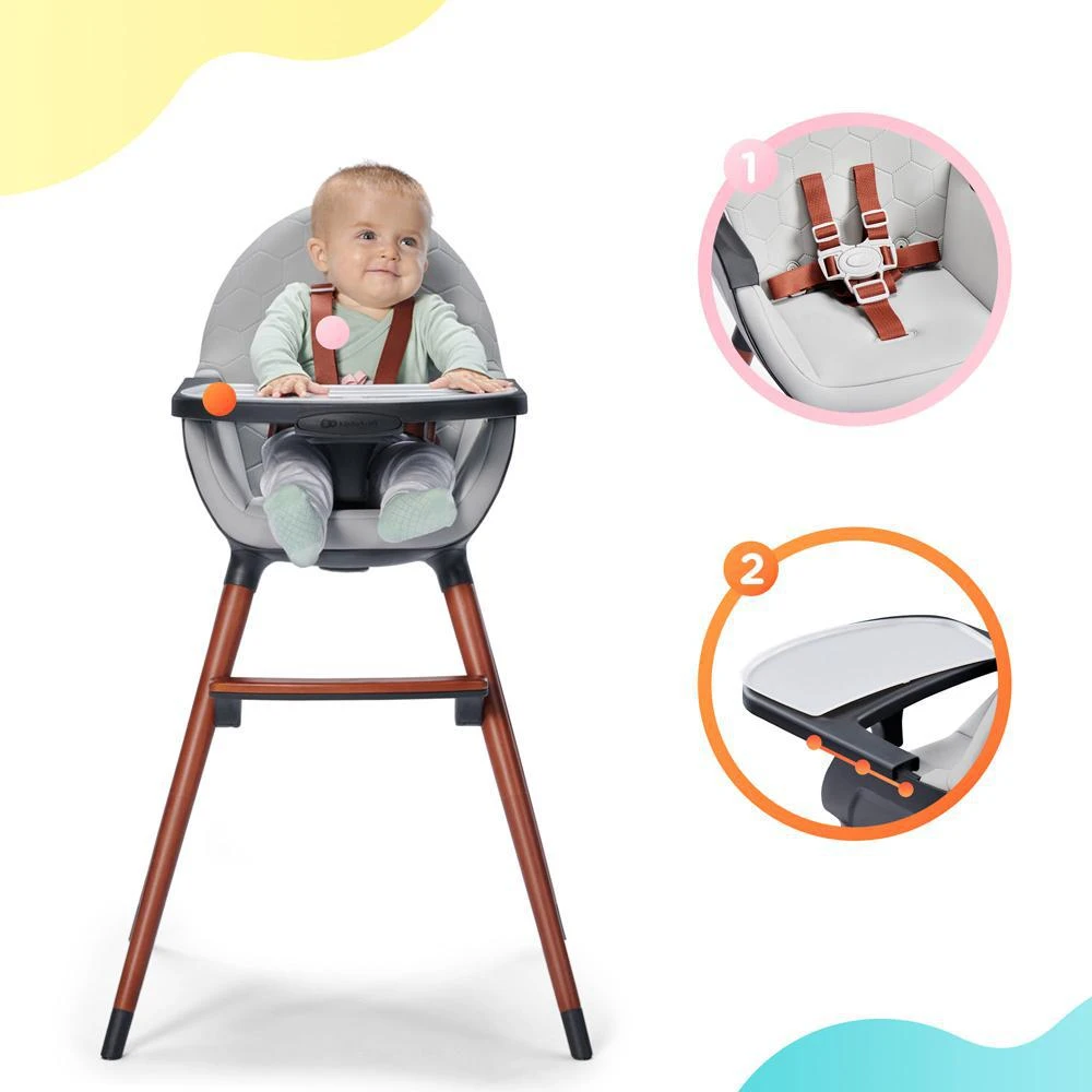 Židlička je navržena s ohledem na pohodlí a funkčnost - nastavitelný podnos v 3 rozsazích má odnímatelnou desku, kterou lze snadno čistit pod tekoucí vodou. Opěrku nohou lze nastavit až ve 2 úrovních: to vše proto, aby se židlička ještě lépe přizpůsobila vašemu dítěti.
