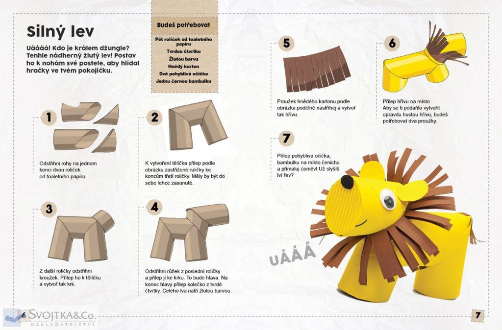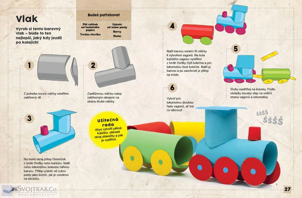 Napadlo vás někdy, že nepotřebné roličky od toaletního papíru nebo kuchyňských utěrek by se daly ještě nějak užitečně a kreativně využít? Strakatý puntíkovaný had, kousavý krokodýl, ale i pestrobarevné rakety a traktory či dinosauří stojánek na tužky – to vše na vás čeká v této knížce plné výrobků z papírových roliček. Zabavte se vyráběním mnoha projektů, jež zde najdete detailně popsány a nafoceny krok-za-krokem. Zhotovíte si celou řadu dekorativních doplňků – do dětských pokojů, kuchyně i do koupelny. Postupy jsou zcela jednoduché, přehledně a výstižně vysvětlené, aby je pochopily i děti. Nepotřebné roličky už nemusí končit v koši! Připravte si nůžky, barvy a lepidla, začtěte se do této knížky a sledujte, jak vám roličky pod vašima rukama přímo ožívají!