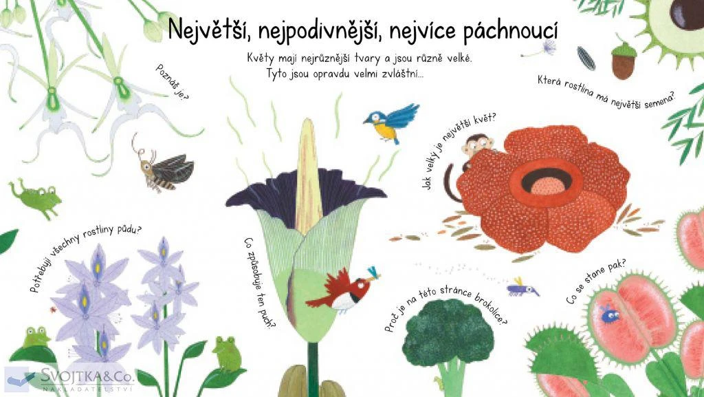 Potřebují rostliny nějakou potravu? Proč mají rostliny květy? Proč jsou květy barevné a hezky voní? Proč mění listy barvu a opadávají? Jaké jsou největší, nejpodivnější a nejvíce páchnoucí rostliny? Odpovědi na tyto a mnoho dalších otázek týkajících se rostlin kolem nás najdete v této krásně ilustrované knížce s odklápěcími okénky.