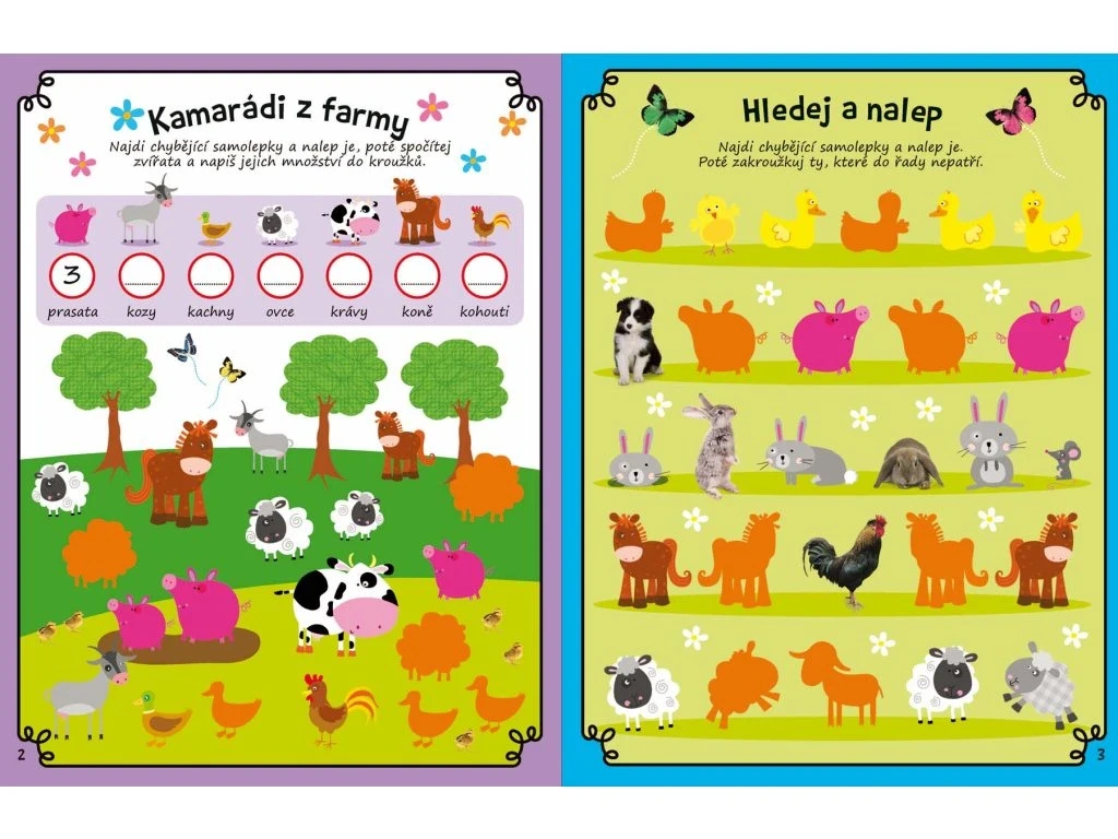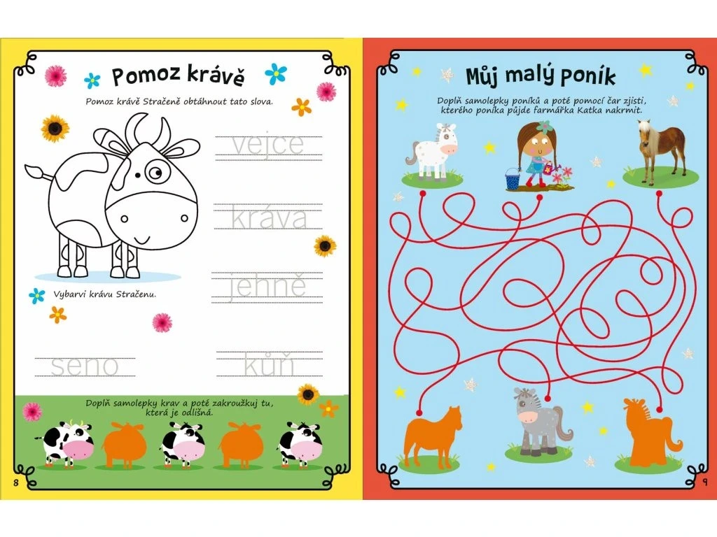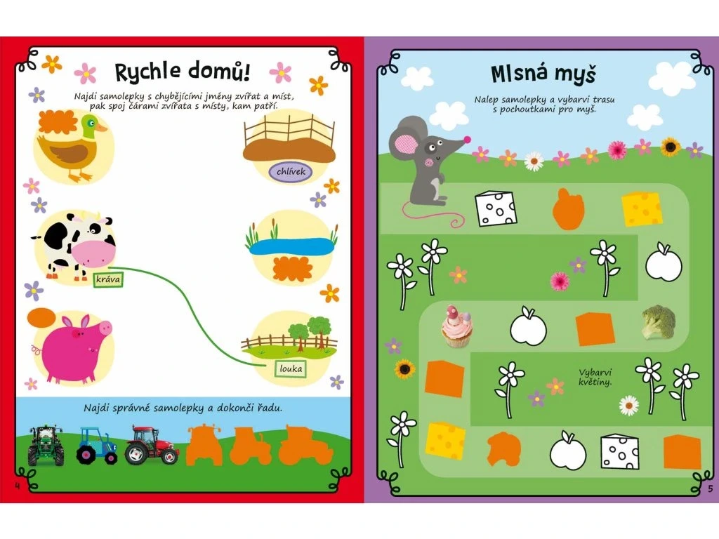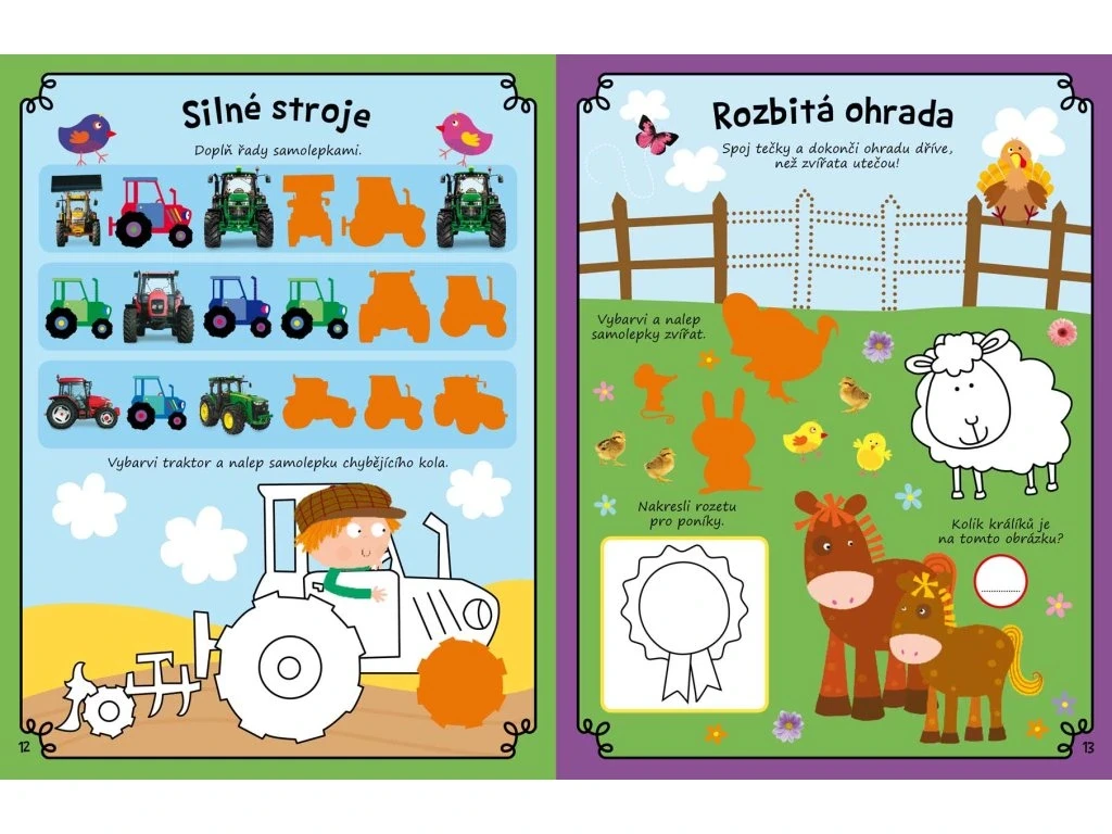 Spoj tečky a dokonči ohradu dříve, než ti zvířata utečou! Vybarvi traktor a nalep samolepku chybějícího kola! Umíš spočítat králíky na tomto obrázku? Nakresli za pomoci mřížky koně podle předlohy... Užij si skvělou zábavu při mnoha úkolech spojených s vybarvováním, doplňováním a nalepováním více než 1000 samolepek do této knížky, plné traktorů a zvířátek z farmy, které si můžeš nalepit buď přímo do této knihy, nebo kamkoli budeš chtít!