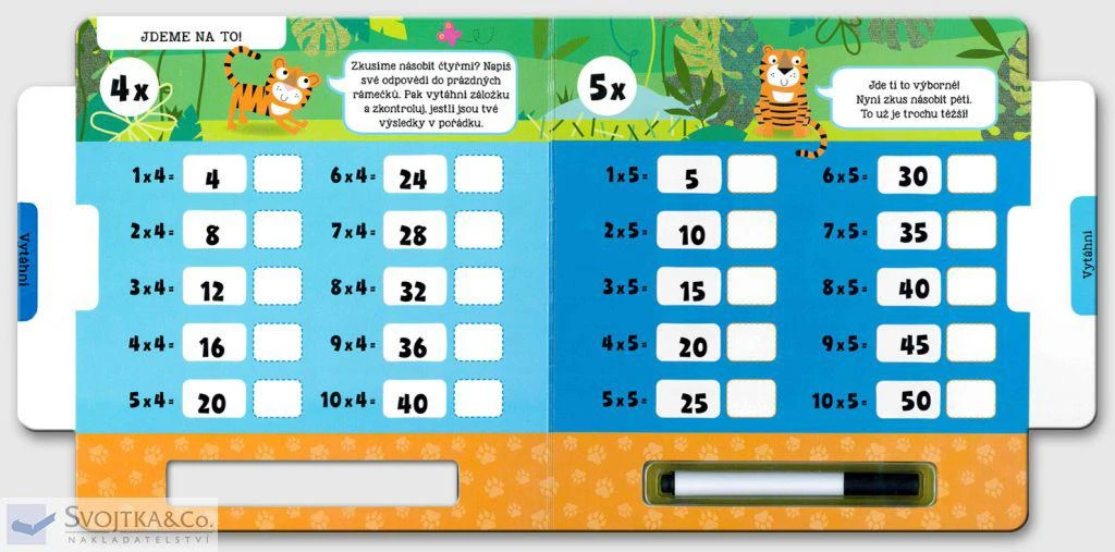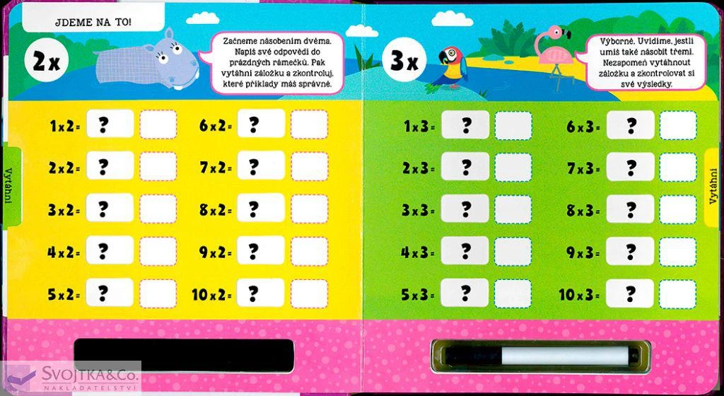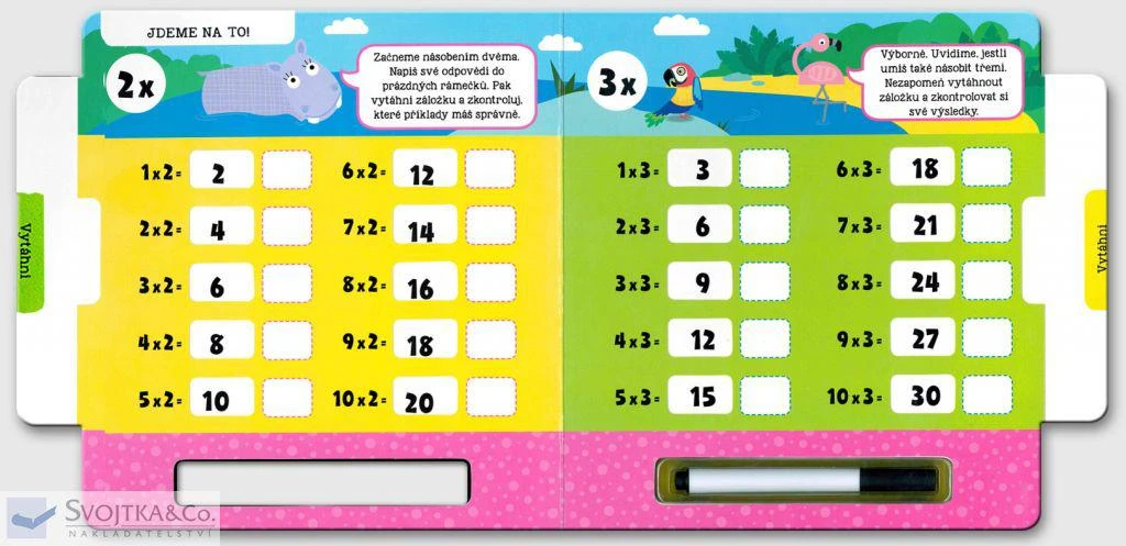 Že se s násobky dvakrát nekamarádíš? Žádný problém – chce to jen trochu procvičovat! Tato interaktivní knížka ti pomůže naučit se perfektně násobit dvěma až deseti. Napiš své výsledky stíratelným fixem do prázdných rámečků, vytáhni záložky na každé stránce a zkontroluj si správnost svých odpovědí. Poté můžeš výsledky setřít a zkusit to znovu. S pestrými ilustracemi a jednoduchými instrukcemi se pro tebe stane násobení opravdovou zábavou!