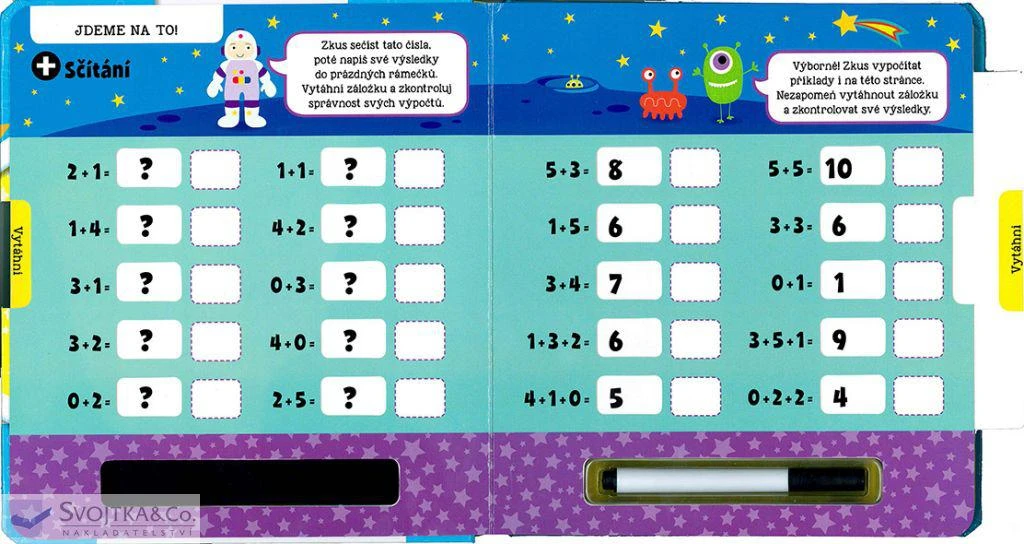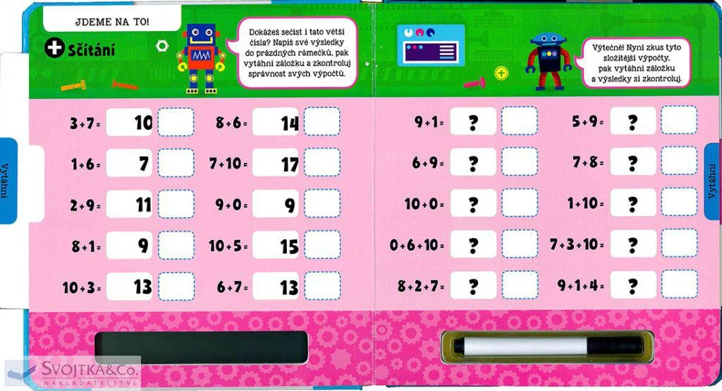 Nejde ti sčítání nebo odčítání? Potřebuješ procvičovat? Tato interaktivní knížka ti pomůže naučit se perfektně sčítat i odčítat. Napiš své výsledky stíratelným fixem do prázdných rámečků, vytáhni záložky na každé stránce a zkontroluj si správnost svých odpovědí. Poté můžeš výsledky setřít a zkusit to znovu. S pestrými ilustracemi a jednoduchými instrukcemi se pro tebe stane počítání opravdovou zábavou!