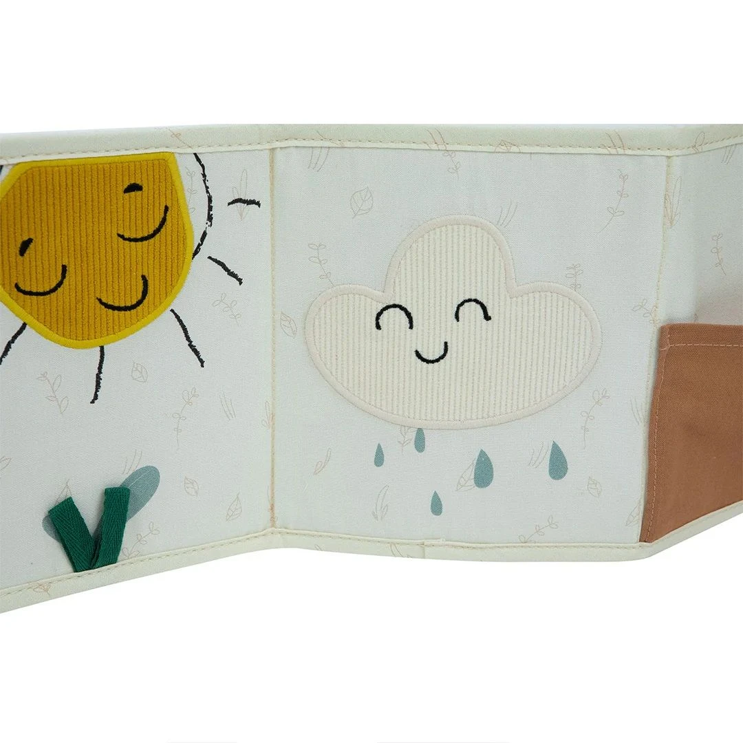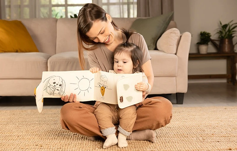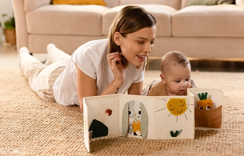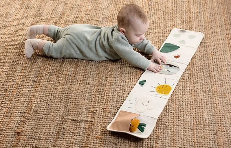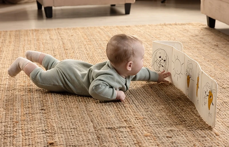 Od 3 měsíců: strana s barevnými obrázky a různorodými texturami ke zkoumání, které podporují rozvoj smyslů a jemné motoriky dítěte.