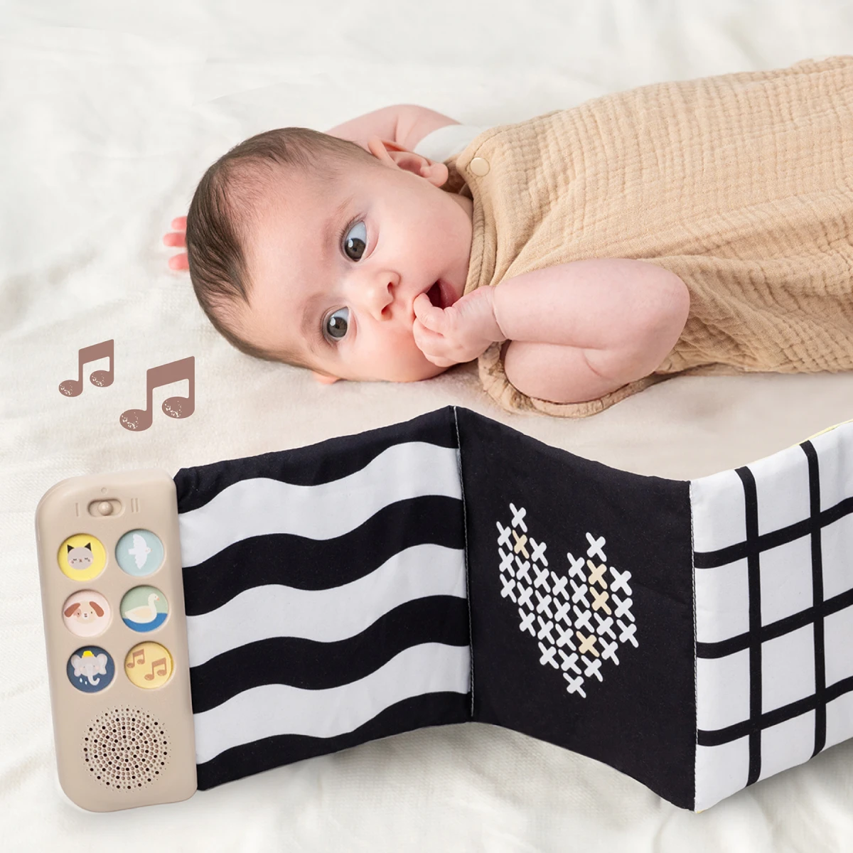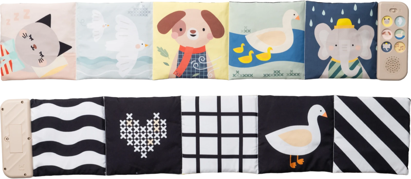 Součástí knížky je hudební modul, který nabízí pět realistických zvuků zvířátek (pes, kočka, slon, kachna a ptáčci), pět zvuků přírody (šumění, mořské vlny, déšť, proudění řeky, tlukot srdce) a sedm minut uklidňujícíh melodií. Zvuky a melodie se snadno pouští pomocí tlačítek.