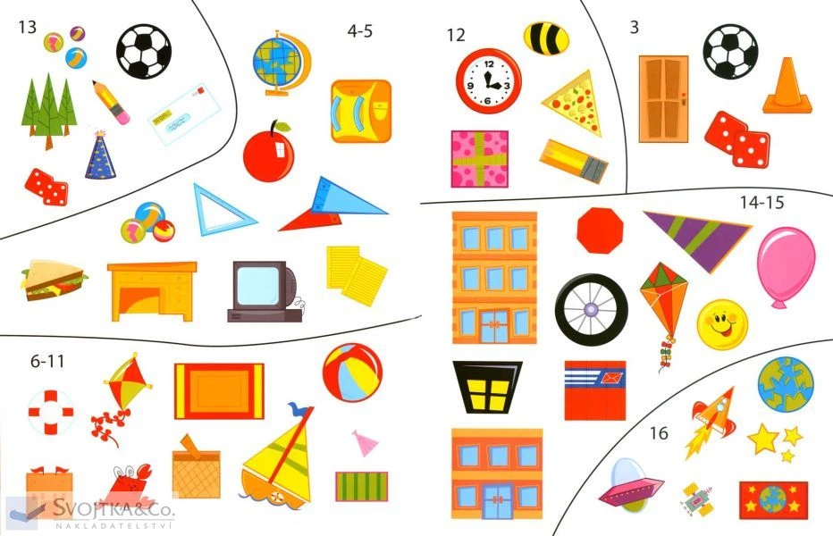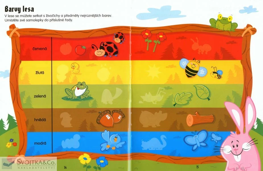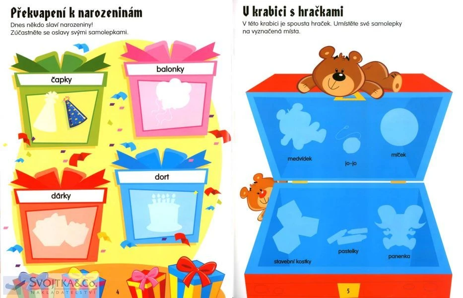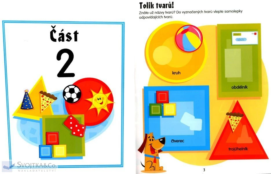 Tato knížka obsahuje více než 200 opakovaně použitelných samolepek. Rozšiřuje slovní zásobu dětí, seznamuje chlapce a děvčátka se světem barev a tvarů i s číslicemi.