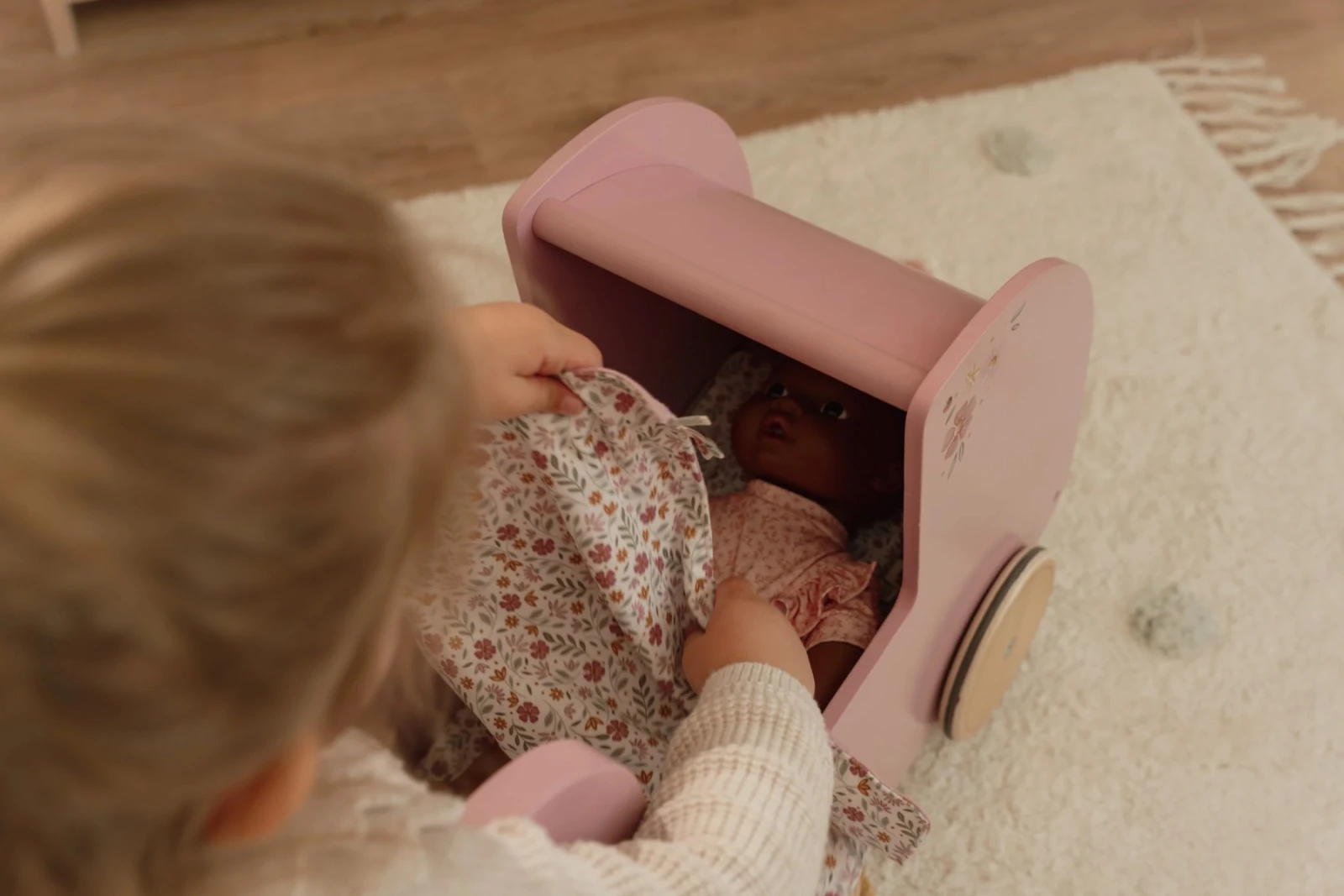 Kočárek pro panenky dřevěný s peřinkou Pink Little Dutch